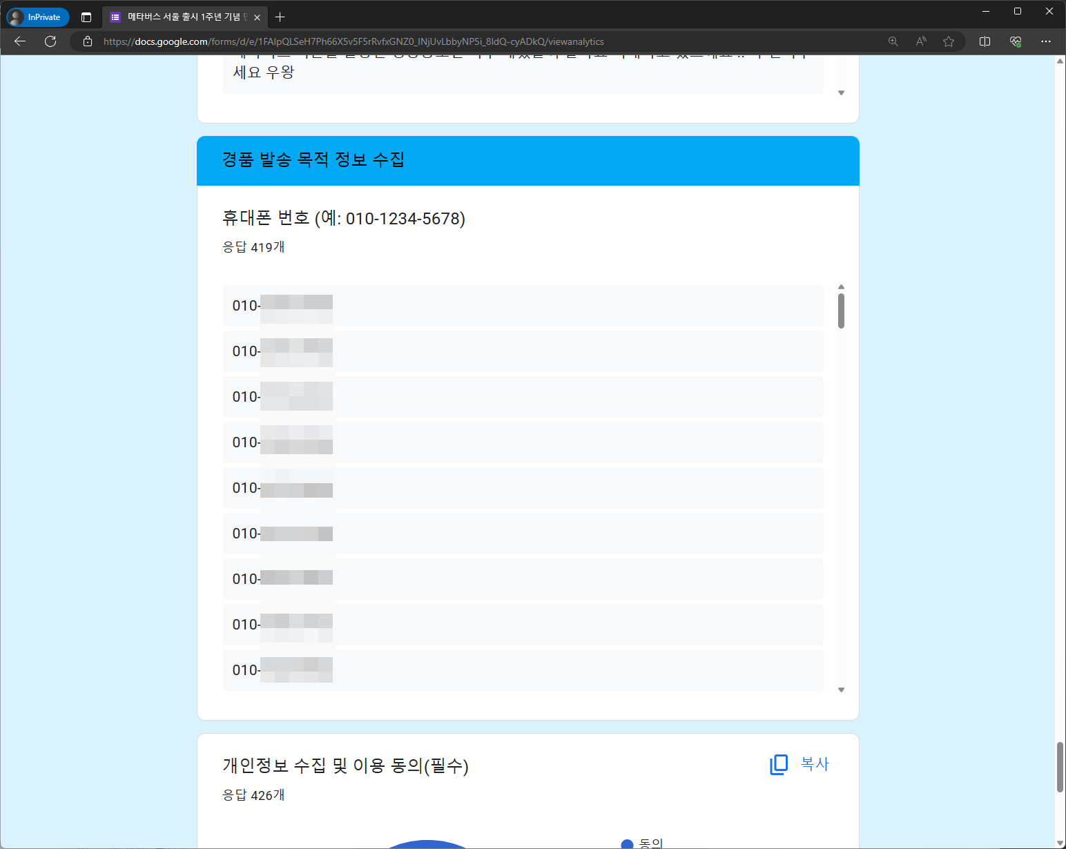 결론적으로 이 이벤트에 참여했던 400여 명의 휴대폰 번호가 아무런 방비 없이 공중에 노출되고 있던 상황. 명백한 개인정보 유출의 현장이 아닐 수 없었다.