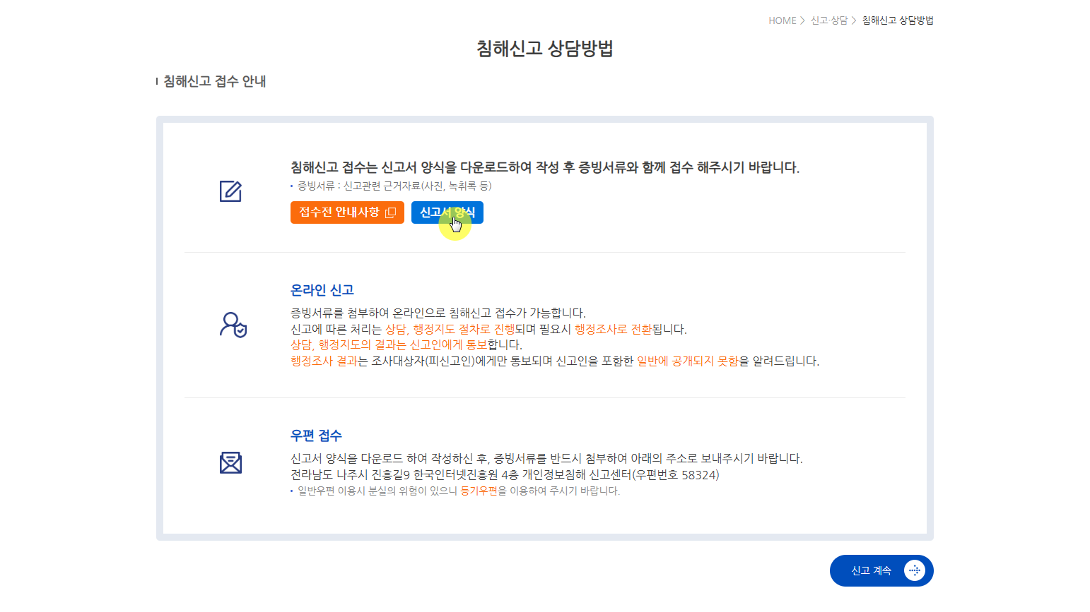 KISA에 침해신고를 넣는 방법으로는 전화, 이메일, 우편 등의 여러 가지 방법이 있는데, 여기서는 홈페이지를 통해 신고하는 방법을 위주로 다루겠다.