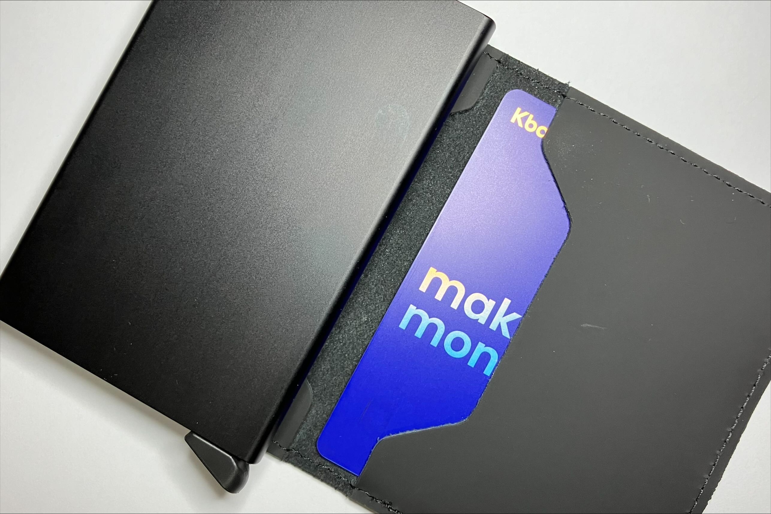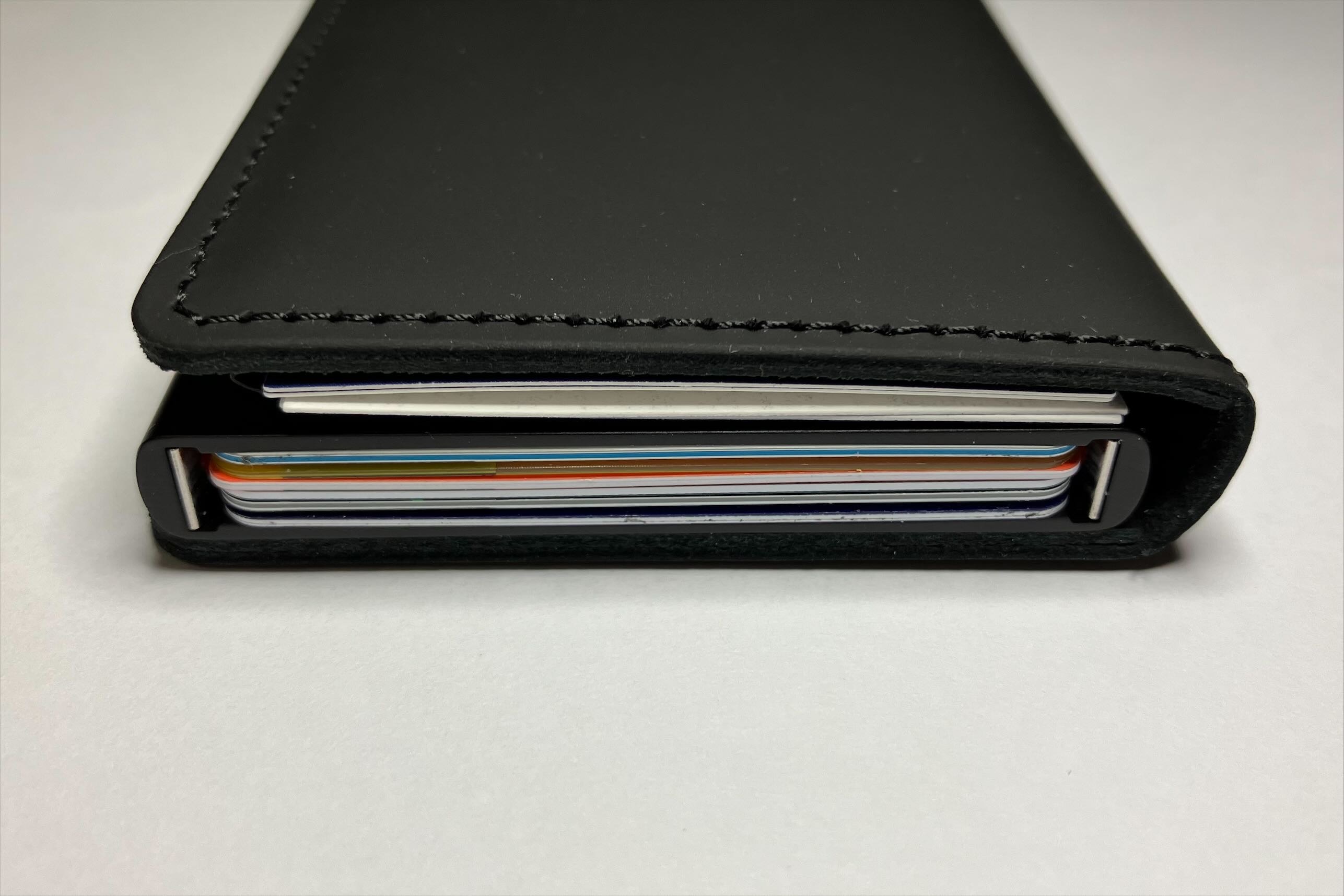 그렇다면 카드를 가죽 폴딩에 끼우면 레버를 굳이 당기지 않고도 찍을 수 있을까?