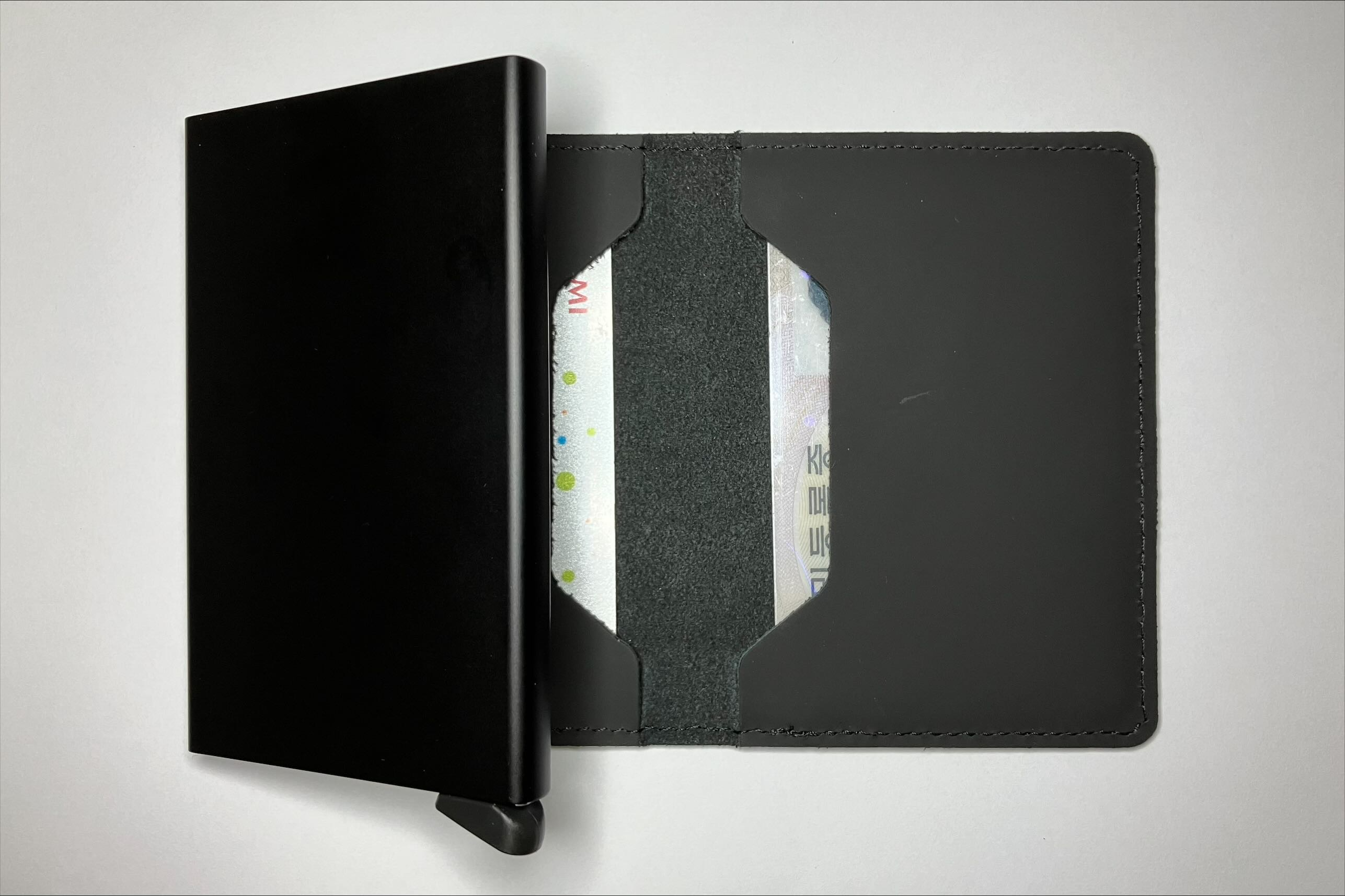 카드 프로텍터의 알루미늄 폼팩터는 RFID 차폐 처리가 되어 있어서, 카드가 완전히 들어가 있을 때에는 교통카드나 컨택리스 결제가 기능하지 않는다.