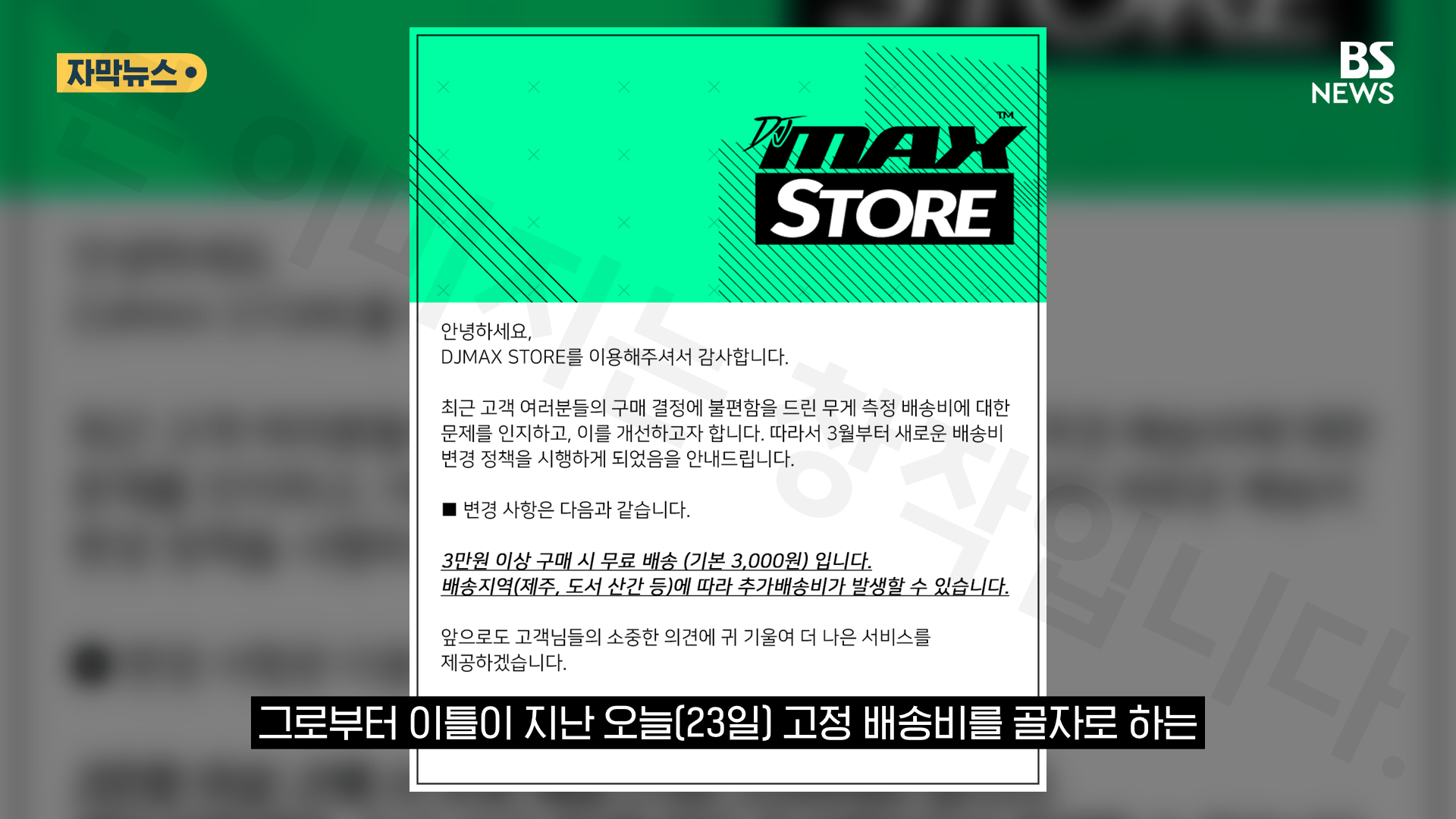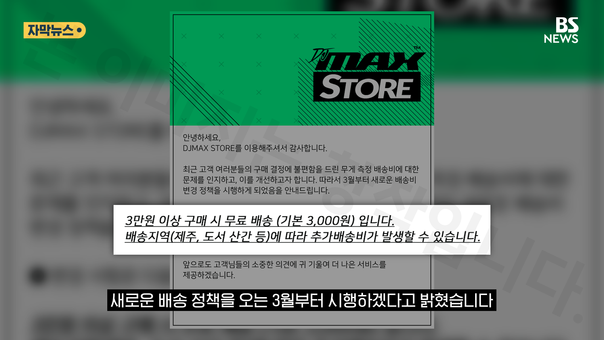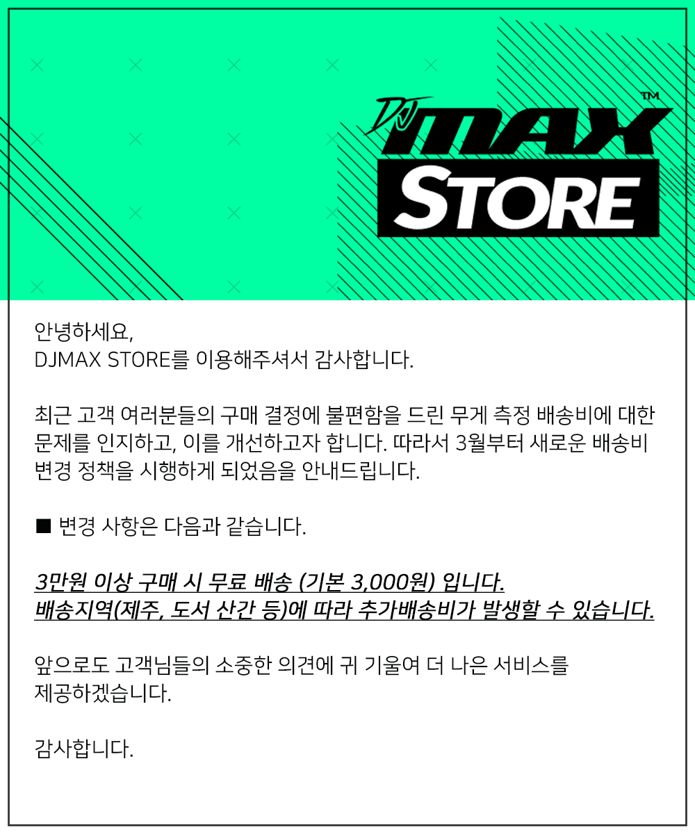 DJMAX STORE의 배송 정책이 오는 3월부터 바뀝니다. 이제 무게별 차등 배송비가 아닌 3,000원의 고정 배송비가 나가고, 3만원 이상 구매할 경우 무료 배송을 받을 수 있습니다.