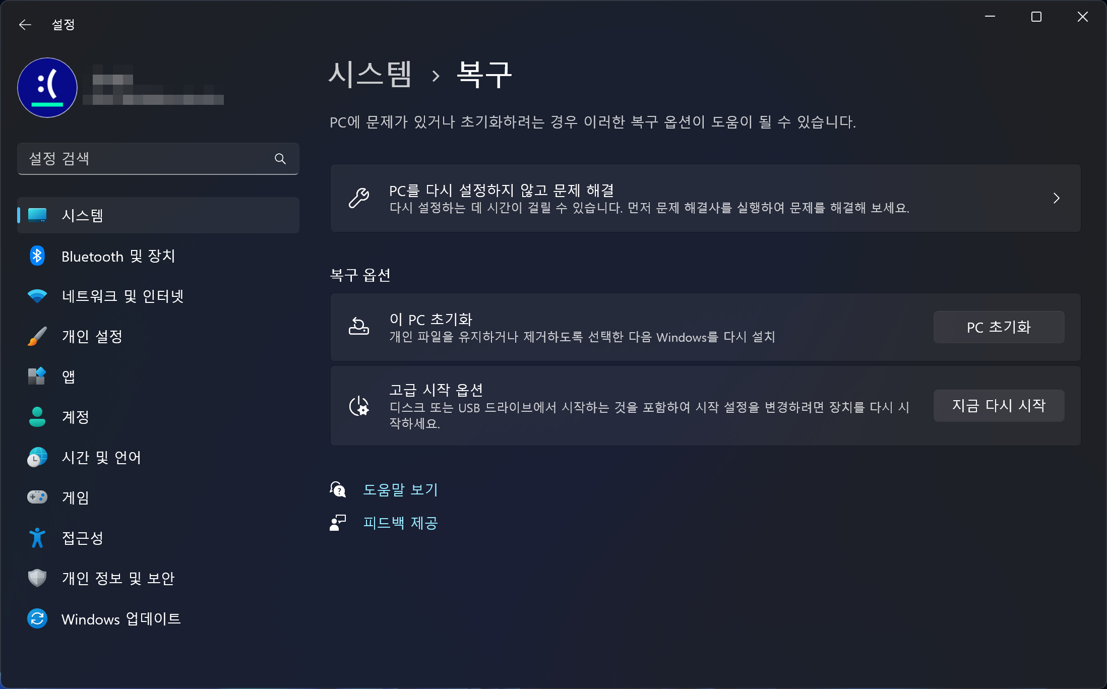 1. [설정] > 시스템 > 복구에 들어가 '고급 시작 옵션' 란에 있는 [지금 다시 시작]을 클릭