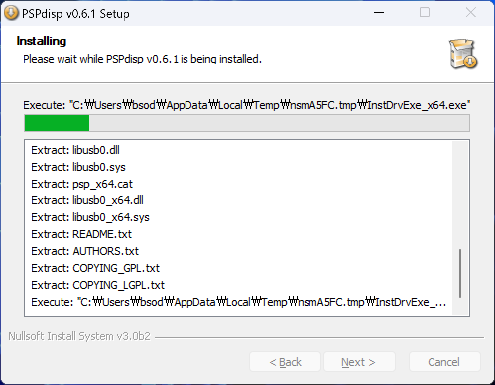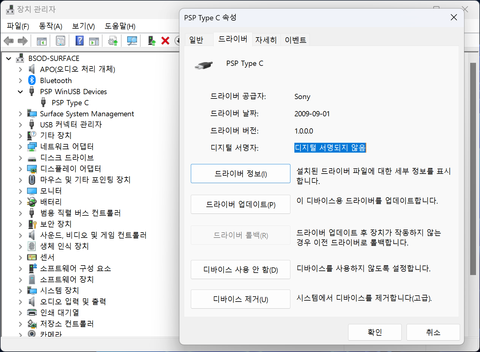 PSPdisp에 쓰이는 PSP Type B/C 드라이버는 디지털 서명이 없어 윈도우 10/11에서는 기본적으로 설치를 거부당하는 문제가 있다.