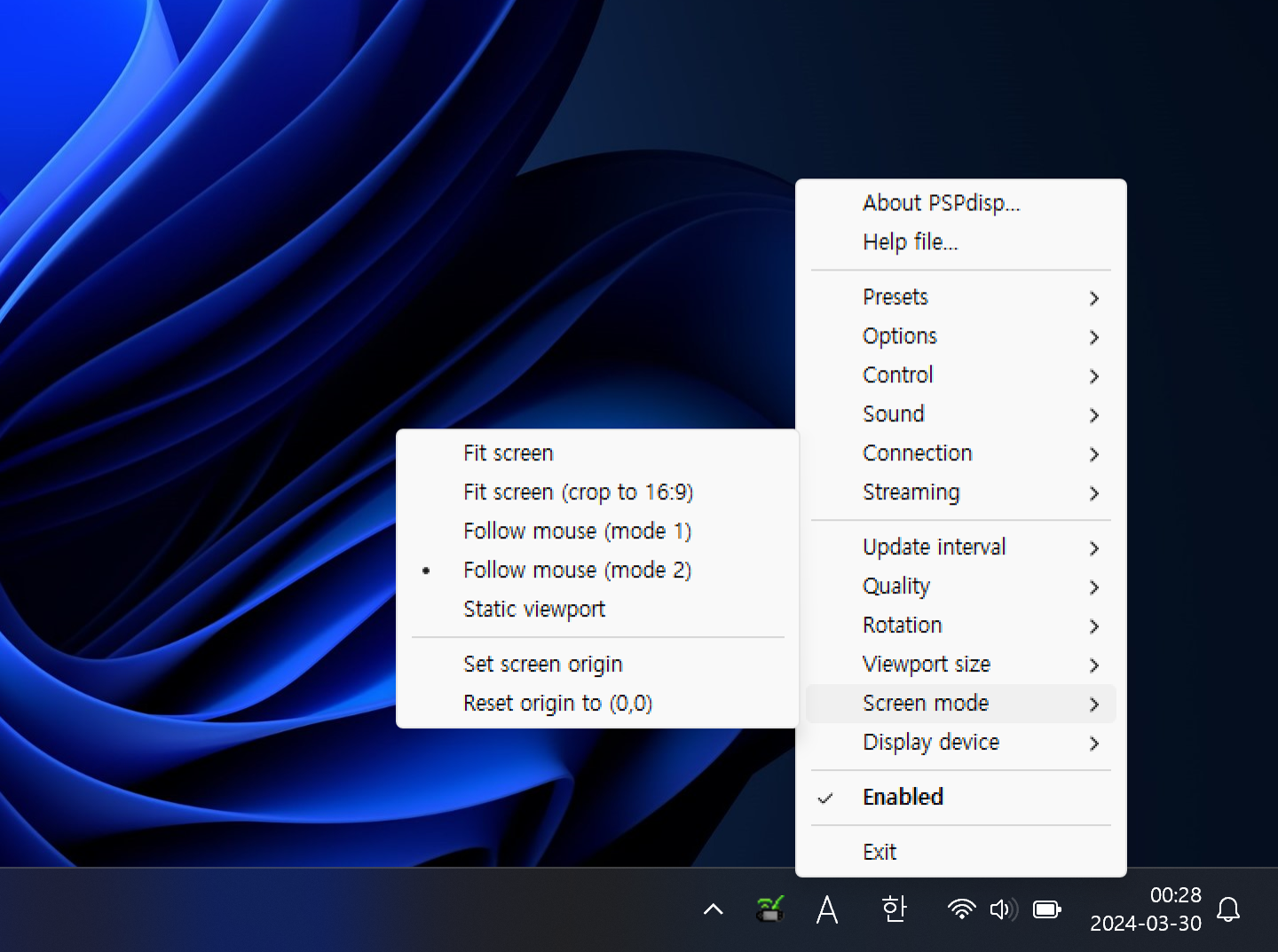 - Follow mouse (mode 1): PSP 화면 상에 놓이는 마우스 포인터의 위치가 유동적이다.