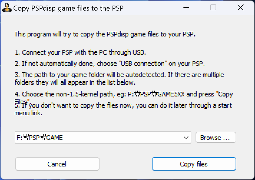 11. PSP를 USB 모드로 연결한 후 경로가 맞는지 확인하고 [Copy Files] 클릭