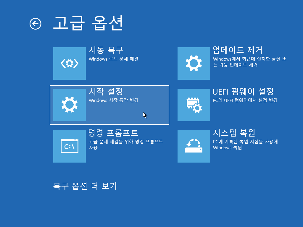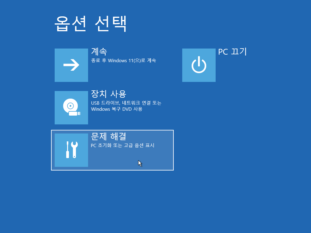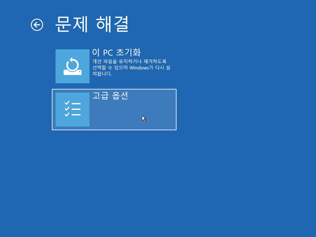 2. 재부팅 후 고급 시작 옵션 화면이 나오면 [문제 해결]을 클릭