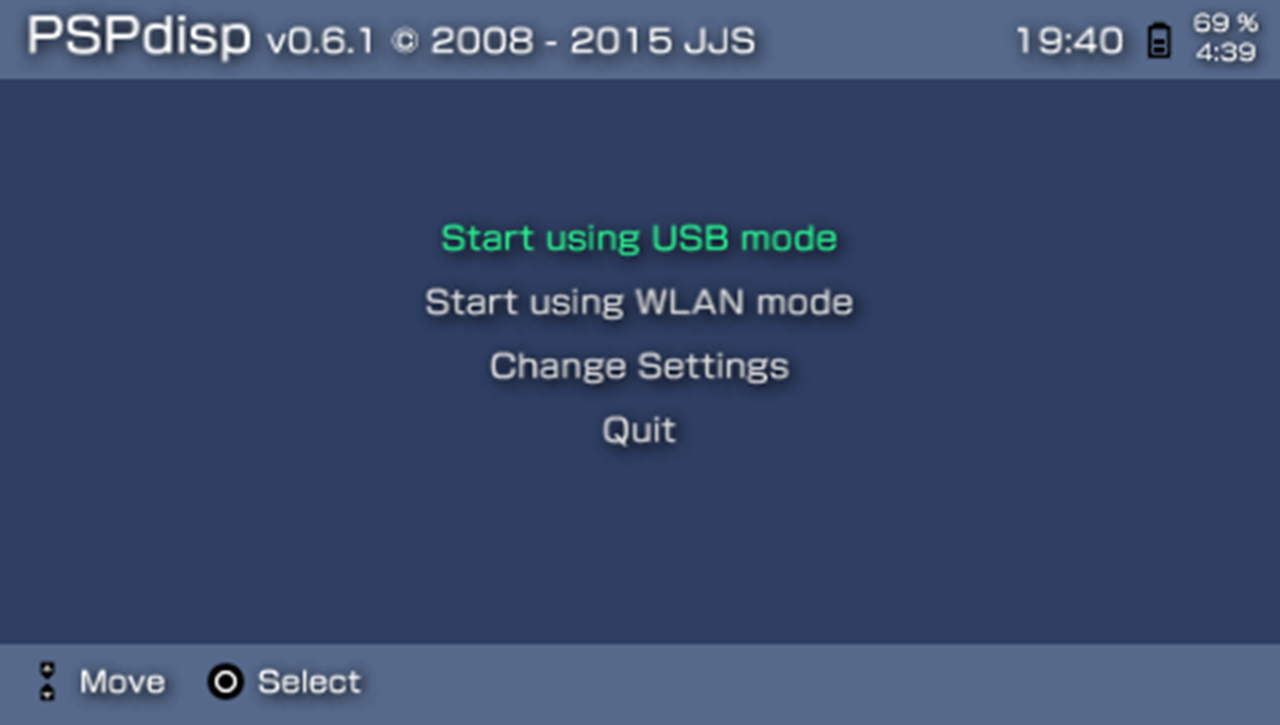 PSPdisp를 실행 중인 PSP를 USB 케이블로 PC에 연결하고, [Start using USB mode]를 선택