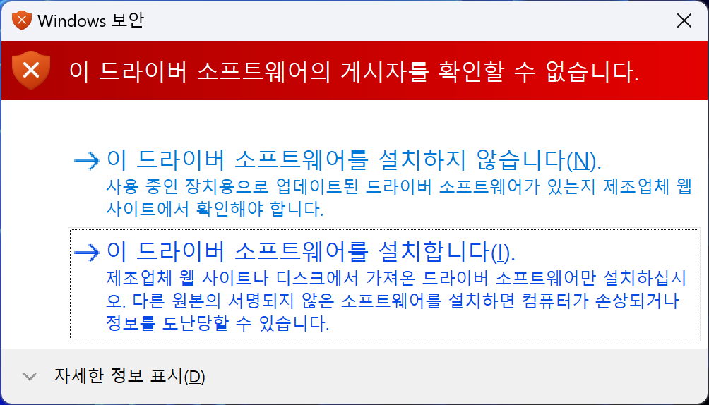 9. 드라이버 설치 중 이런 화면이 나오면 [이 드라이버 소프트웨어를 설치합니다.] 클릭