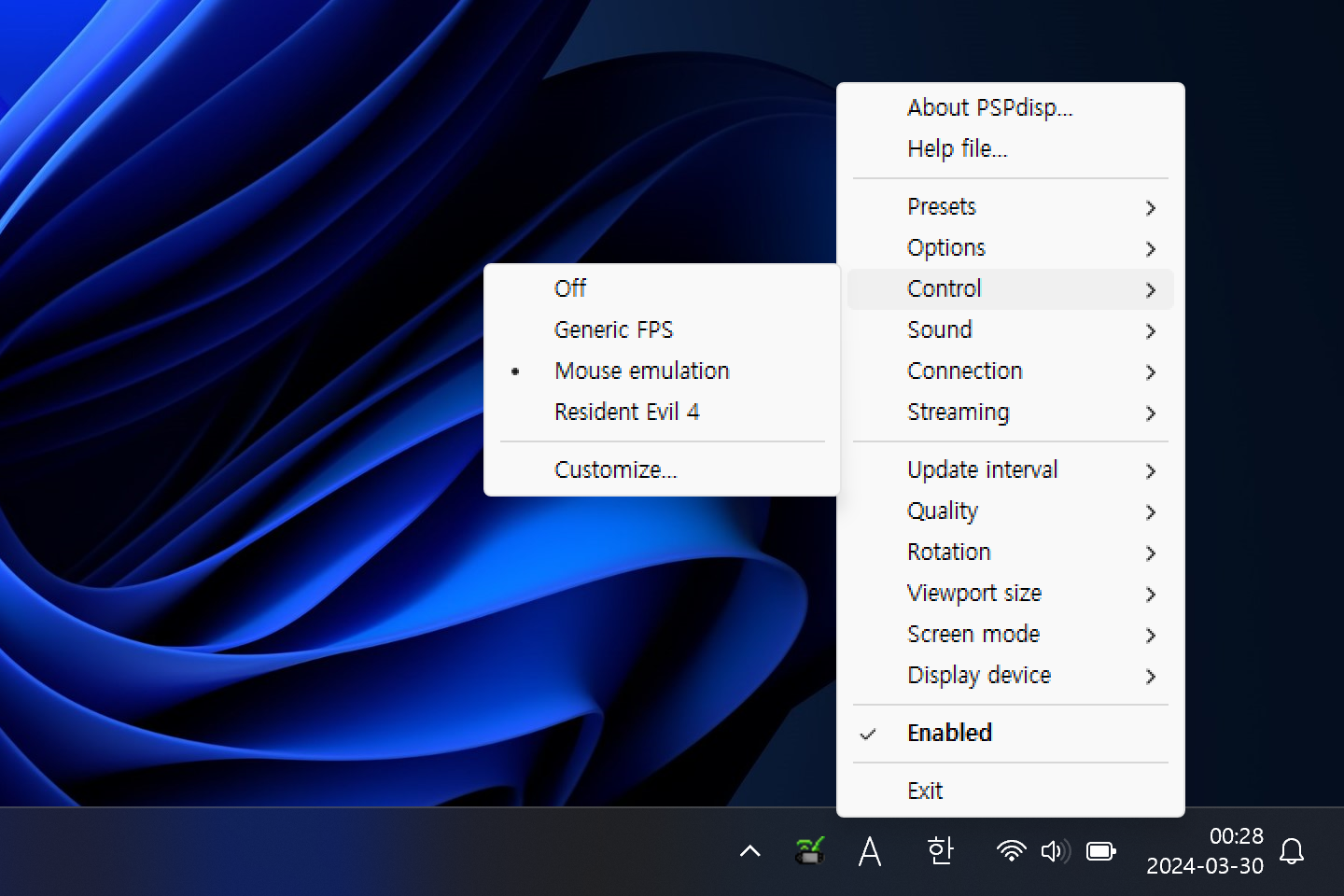 - Follow mouse (mode 1): PSP 화면 상에 놓이는 마우스 포인터의 위치가 유동적이다.