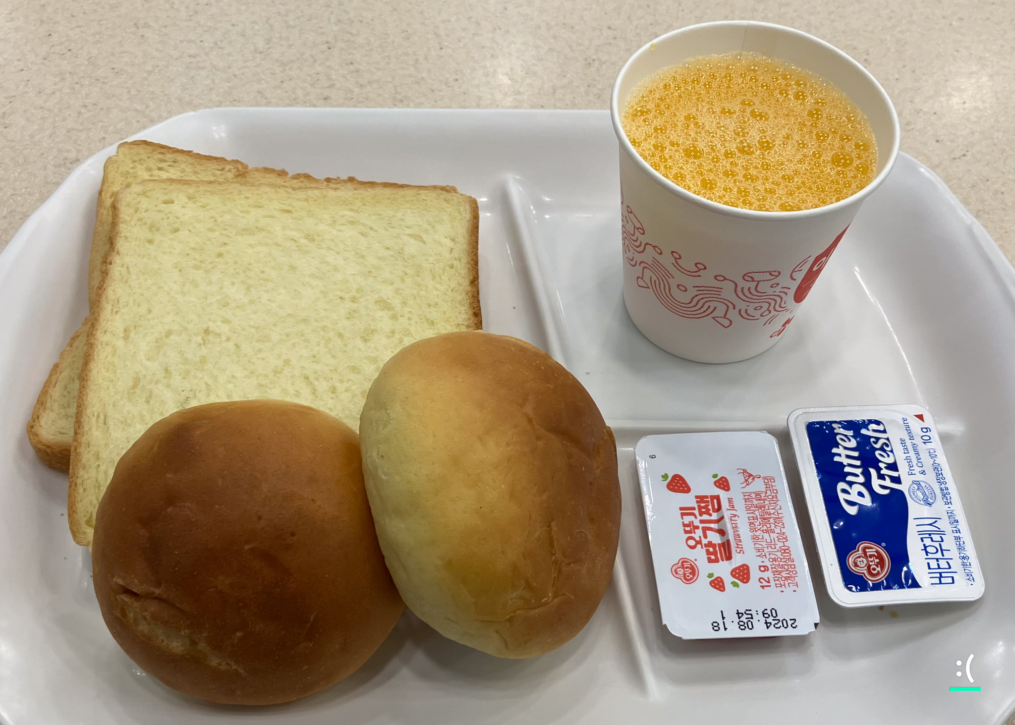 빵 코너에서는 모닝빵식빵을 베이스로 여기에 곁들여 먹을 수 있는 딸기잼과 버터도 제공한다. 토스팅도 가능.