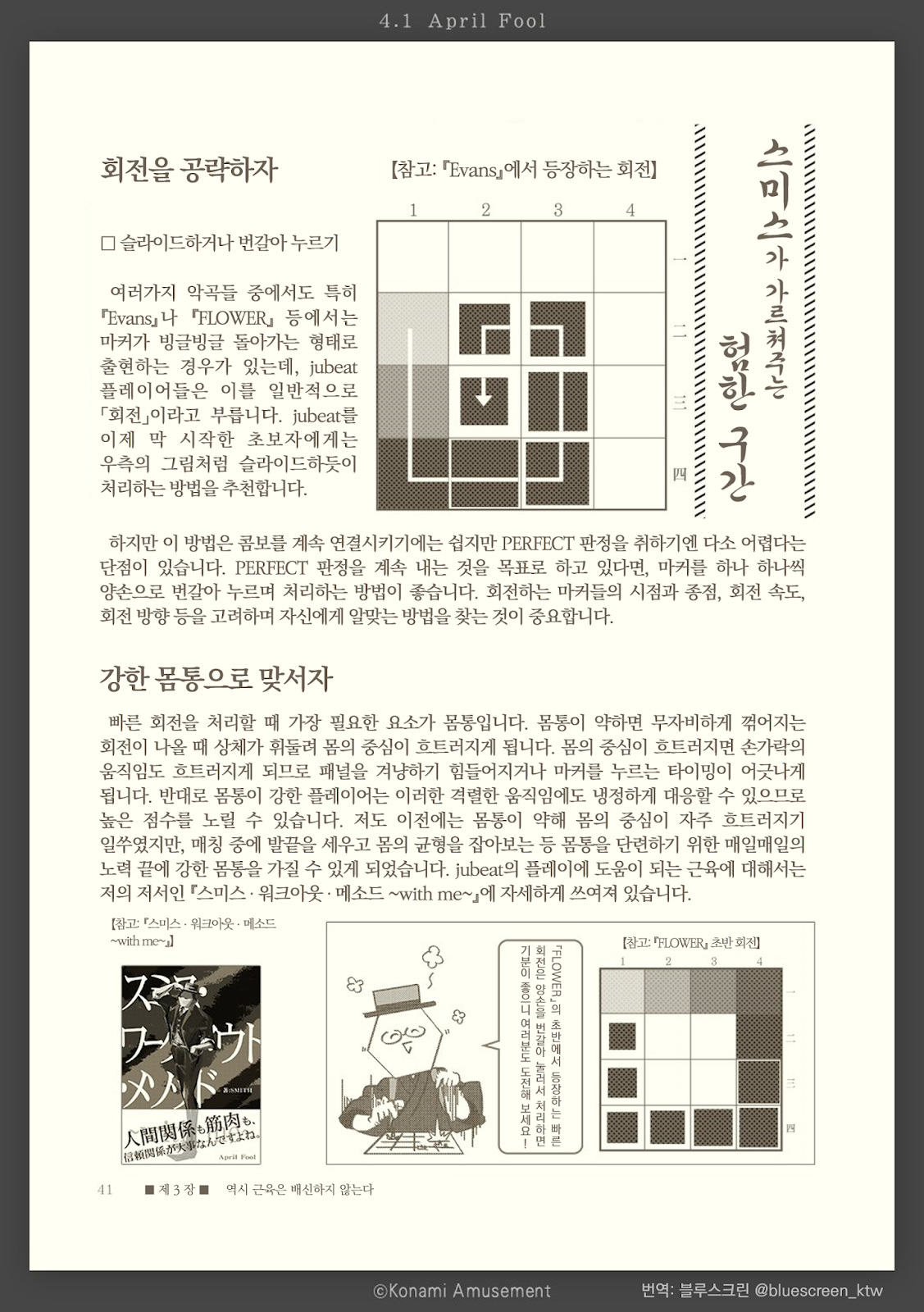 KONAMI의 아케이드 리듬 게임 'jubeat' 시리즈의 스태프들이 2019년 만우절을 기념하며 이벤트성 콘텐츠로 올렸던 '스미스표 jubeat 입문서' 샘플 페이지를 한국어로 번역 및 재편집해 본 이미지이다.
