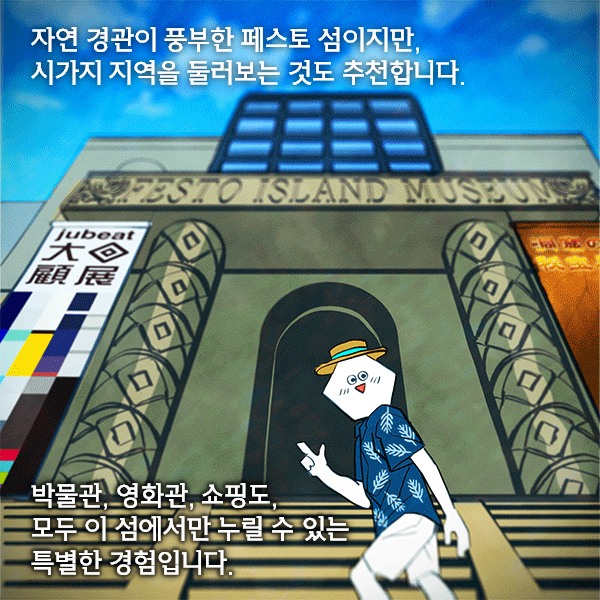 'jubeat'를 비롯한 KONAMI의 아케이드 리듬 게임 플레이어들을 대상으로 2020년 가을 즈음에 'BEMANI 투표선발전'라는 이벤트가 개최된 적이 있었다. 이 이벤트의 종료 보상으로 ‘jubeat’ 스태프들이 준비한 이벤트성 콘텐츠인 '스미스씨 전면감수! 페스토 섬 가이드'를 한글로 번역 및 재편집해 보았다.