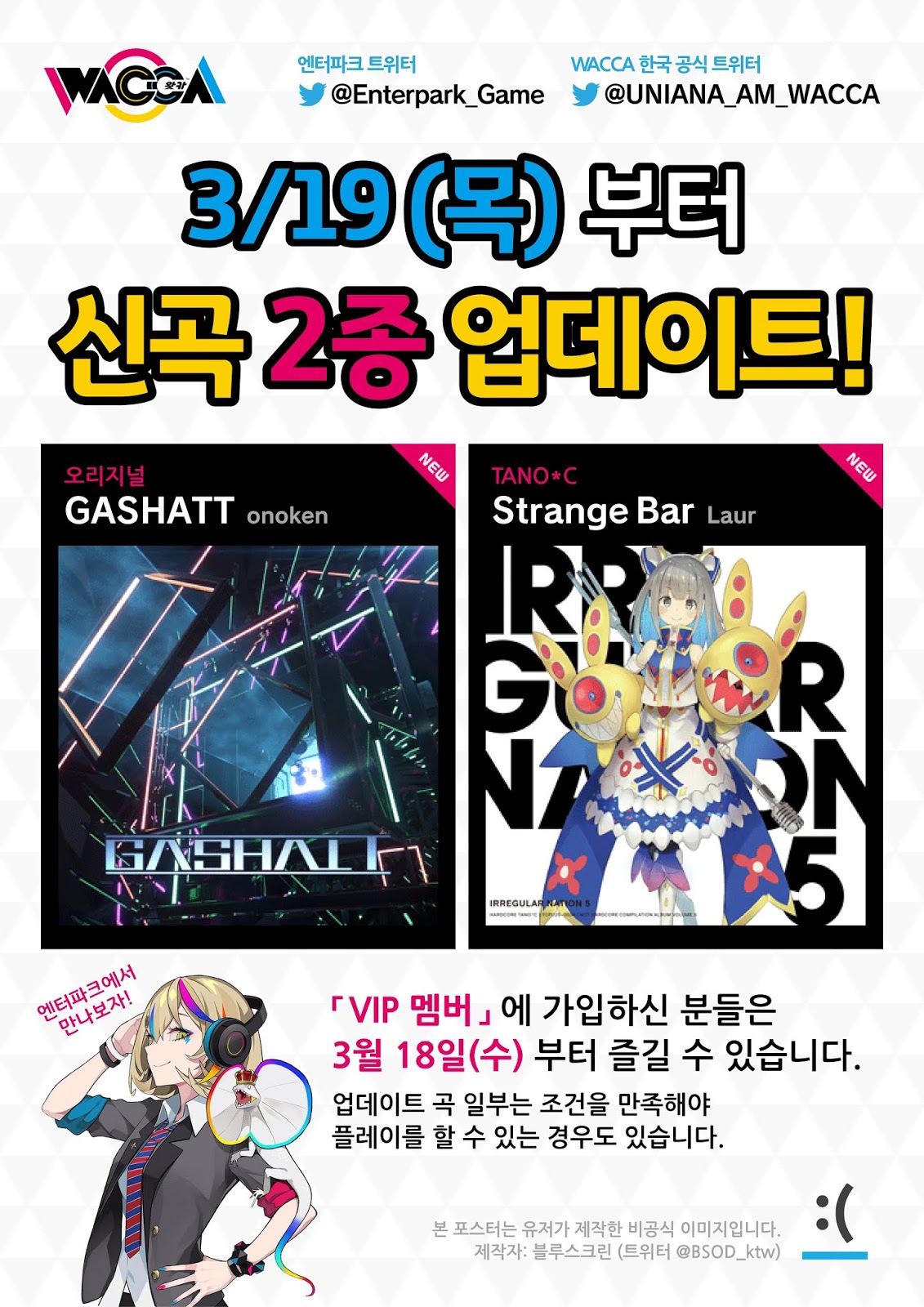 인천광역시 부평구에 위치한 '엔터파크'라는 오락실 내에 게시할 목적으로 만들어진, 아케이드 리듬 게임 'WACCA'의 3월 19일 신곡 업데이트 소식을 정리한 포스터를 디자인했다.