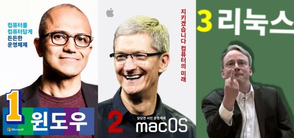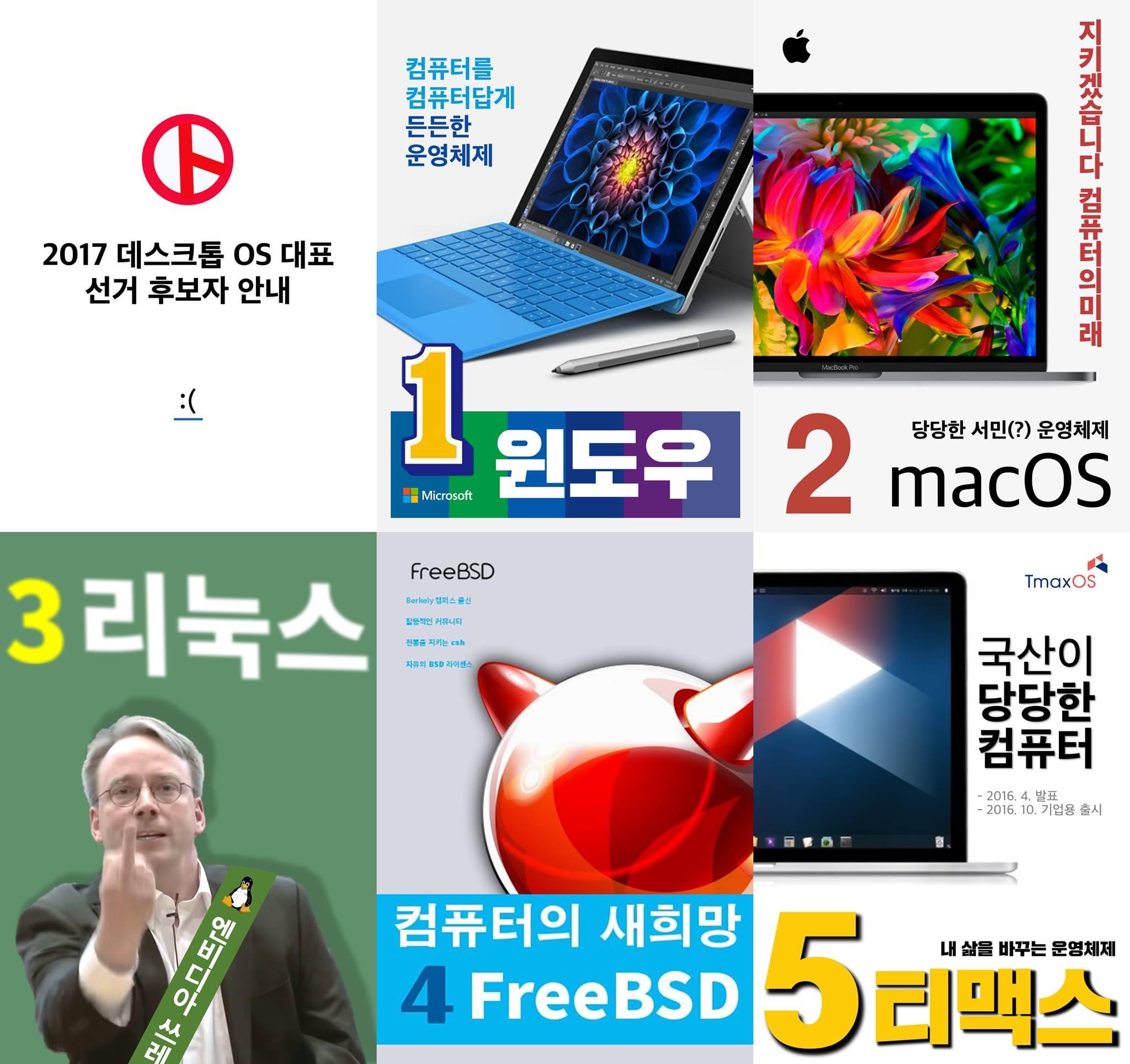 2017년 5월 9일에 예정되어 있던 19대 대통령 선거를 앞두고 선거 운동이 활발하던 당시, 대선 후보자들이 제출한 포스터에서 보여진 각양각색의 디자인에서 영감을 얻어 이를 데스크톱 OS 경쟁 구도에 대입시켜 본 합성물입니다.