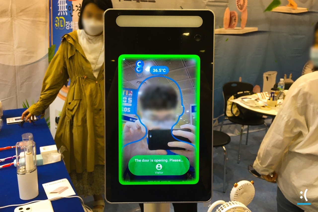 전시회장 입구와 일부 부스에서도 이런 모양의 비접촉 출입 게이트가 가동되고 있었다. 이러한 시스템들은 보통 열감지 카메라를 통해 게이트 앞에 선 사람의 체온을 측정하는 것 이외에도 안면 인식 카메라로 사전에 등록된 인물인 지의 여부를 식별한 후 출입 상황을 기록하는 기능을 두루 갖추고 있다.