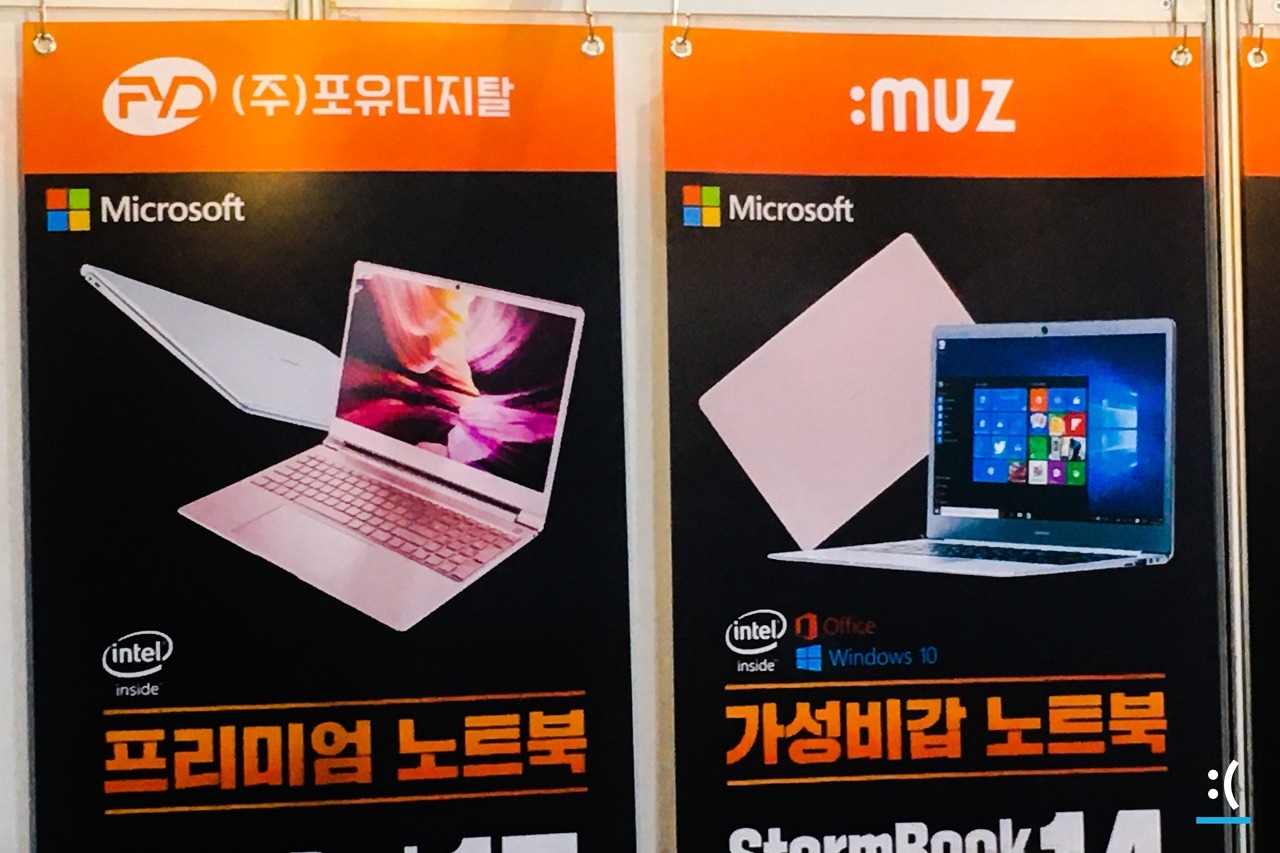 부스 내부의 현수막들과 관람객들에게 배부된 제품 안내서에는 마이크로소프트 사의 공식 파트너라는 문구가 굉장히 자랑스럽게 붙어있다. 이에 걸맞게 노트북 제품군인 ‘스톰북‘ 시리즈의 대부분 제품들에는 윈도우 10과 MS 오피스 2016의 평생 버전이 기본 제공된다.