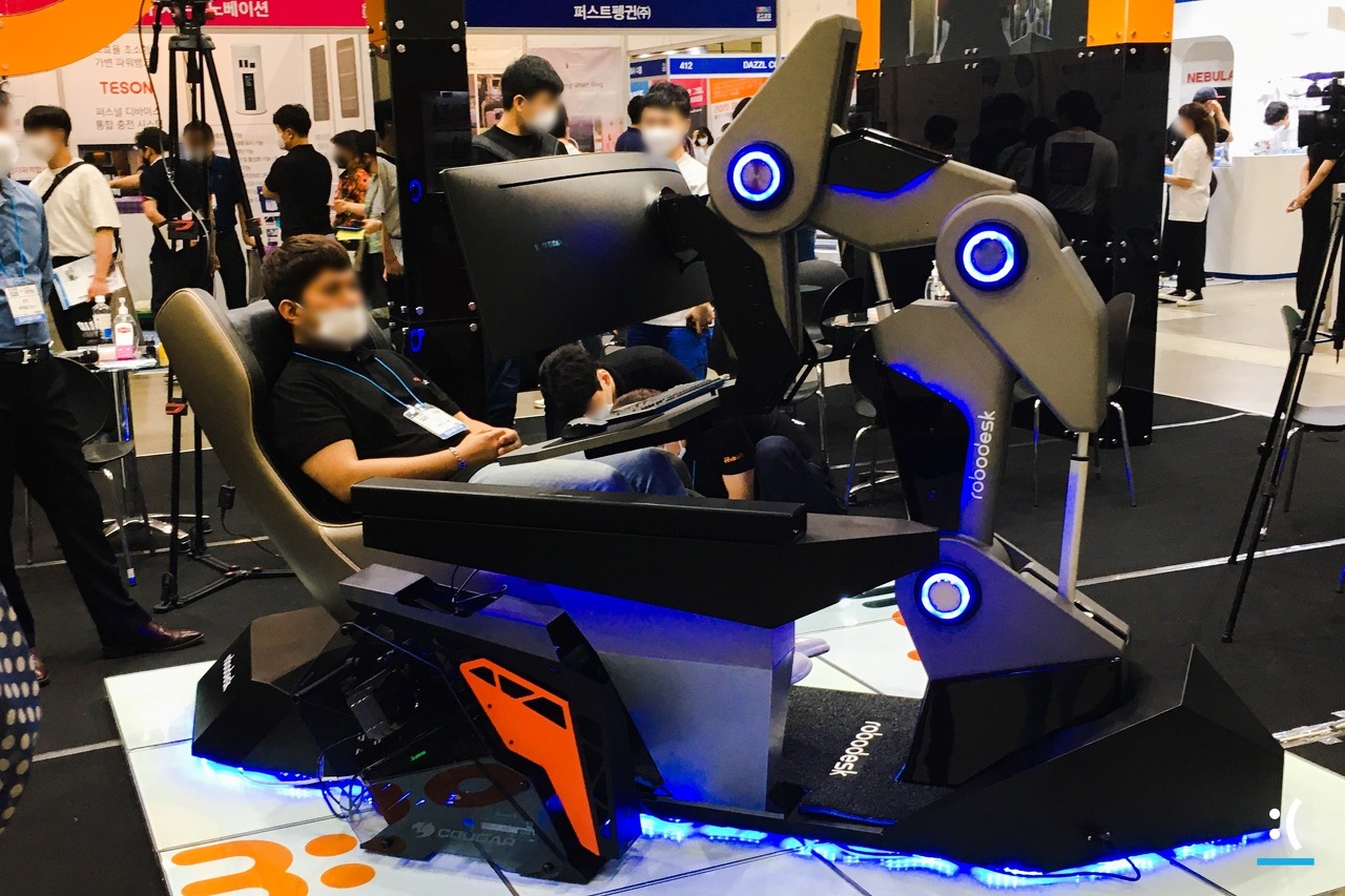 전시회장 입구에서 가장 가까운 부스에는 ‘모인 로보데스크‘의 시제품이 놓여 있었다. 편안한 안마 의자, 관절에 의해 자유자재로 움직이는 책상과 32:9 모니터, 화려한 색을 발하는 LED 등이 모두 합쳐져 있는 이 제품의 모습은 마치 요즘 뜨고 있는 ‘사이버펑크(Cyberpunk) 감성’을 떠올리게 한다.