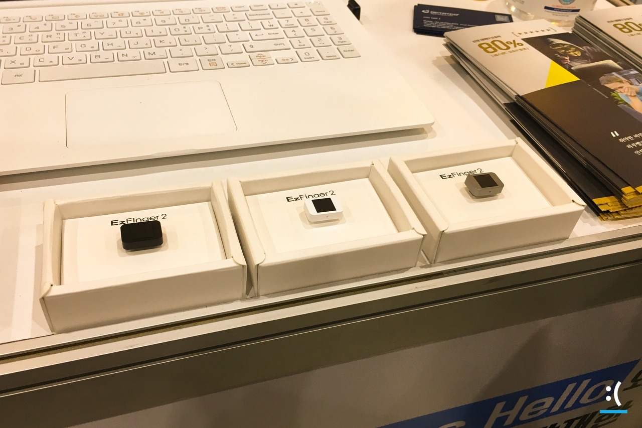 옥타코의 부스에서는 꽤 흥미로운 물건을 볼 수 있었다. USB 인터페이스를 사용하는 외장형 지문 인식기 ‘이지핑거2‘다.