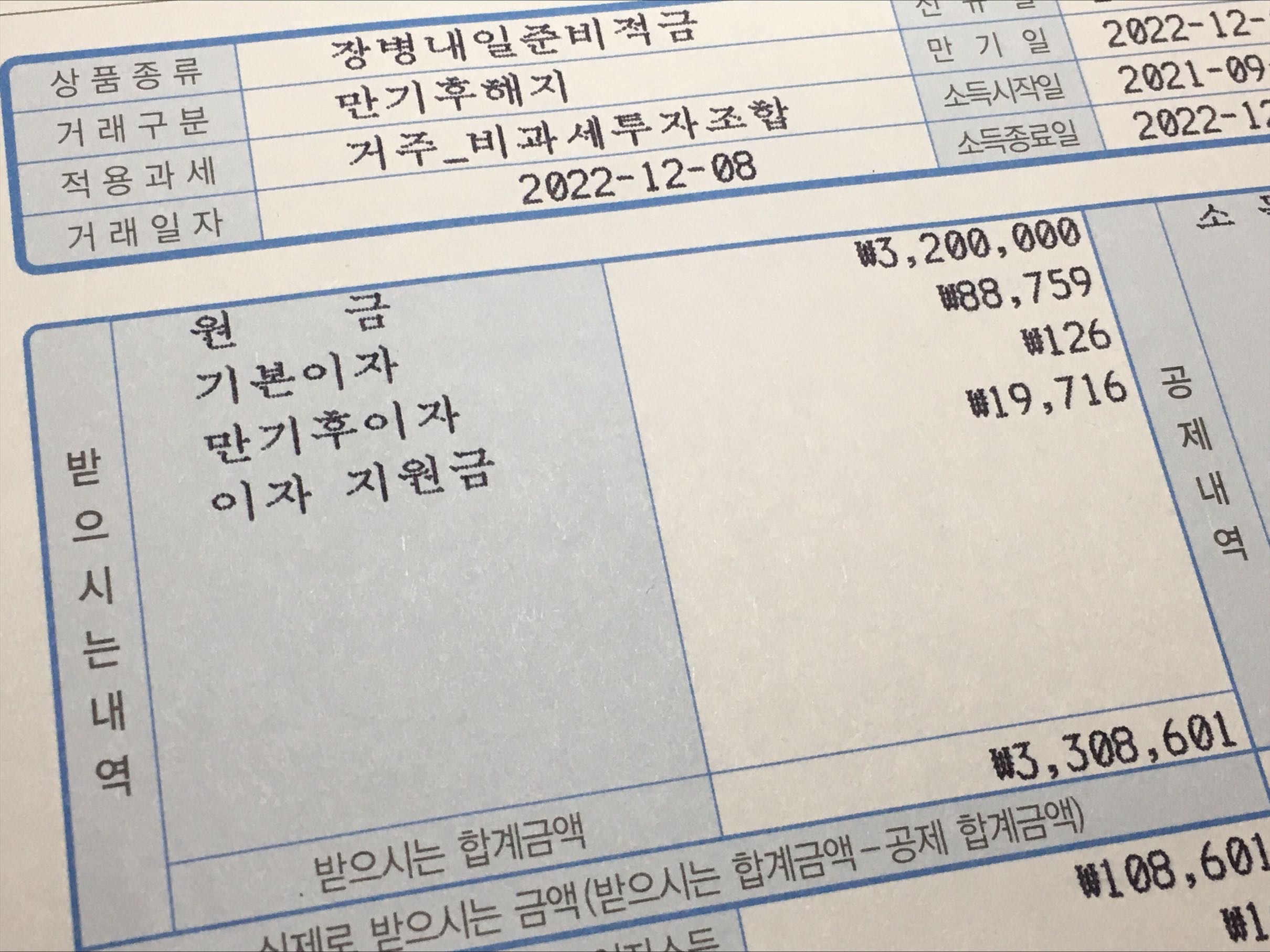 심지어 올해부터 '매칭 지원금'이라는 제도가 신설된 덕분에 적금 이자 이외에도 올 한 해 적금에 납입했던 원금의 33%에 해당하는 약 160만 원을 추가로 받을 수 있게 되어서, 실질적으로 내가 전역 이후 만질 수 있는 목돈은 총 845만 원이 된다.
