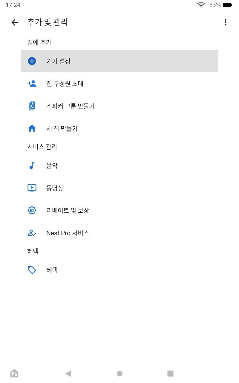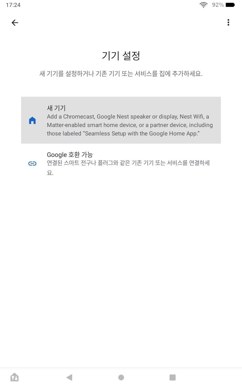 Google 계정 로그인과 권한 허용 작업을 마치고 나면 위의 첫 번째 사진과 같은 메인 메뉴가 나오는데, 여기서 왼쪽 상단의 '+' 버튼을 누르고, [기기 설정], [새 기기]를 차례대로 누른다.