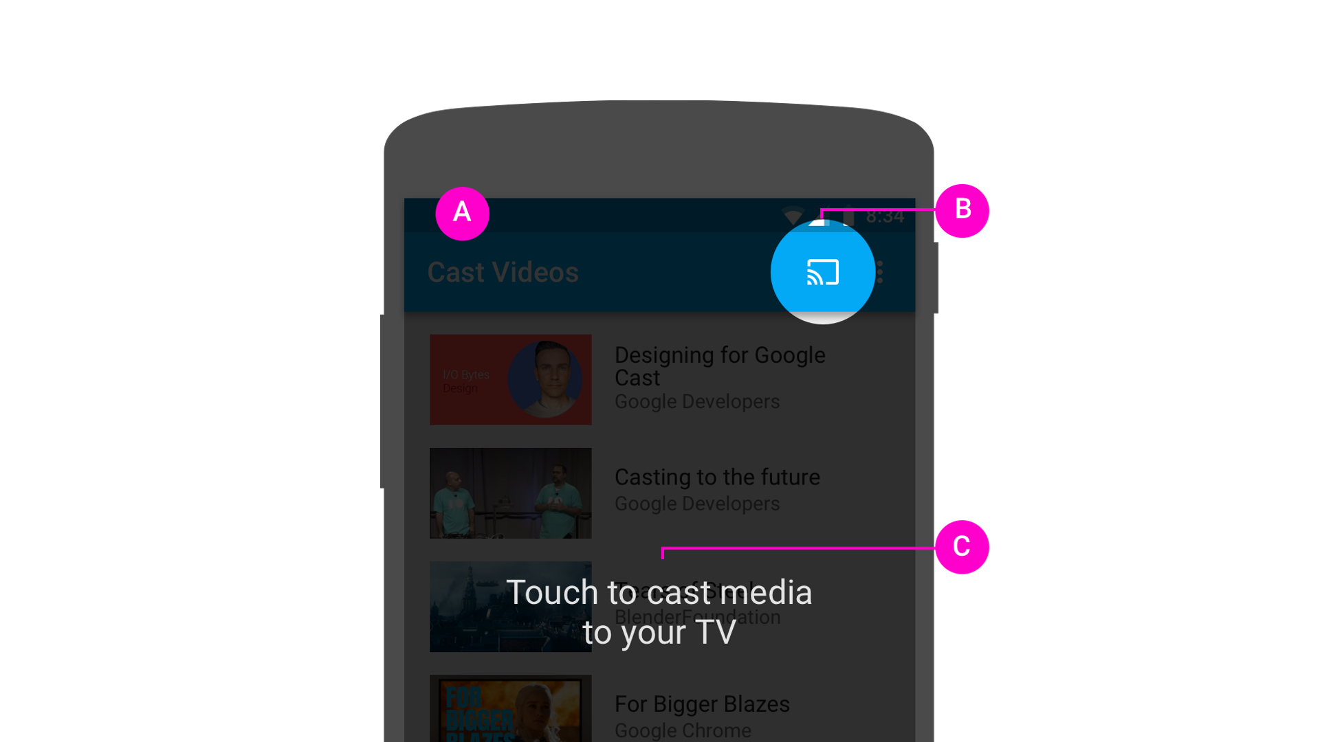 크롬캐스트에서 보고 싶은 영상을 감상하는 방법은 간단하다. 크롬캐스트와 같은 Wi-Fi 네트워크에 연결된 디바이스에서 크롬캐스트를 지원하도록 설계된 앱을 사용하는 경우 위의 사진에서 'B'와 같이 생긴 '캐스트 버튼'을 누르면 된다.