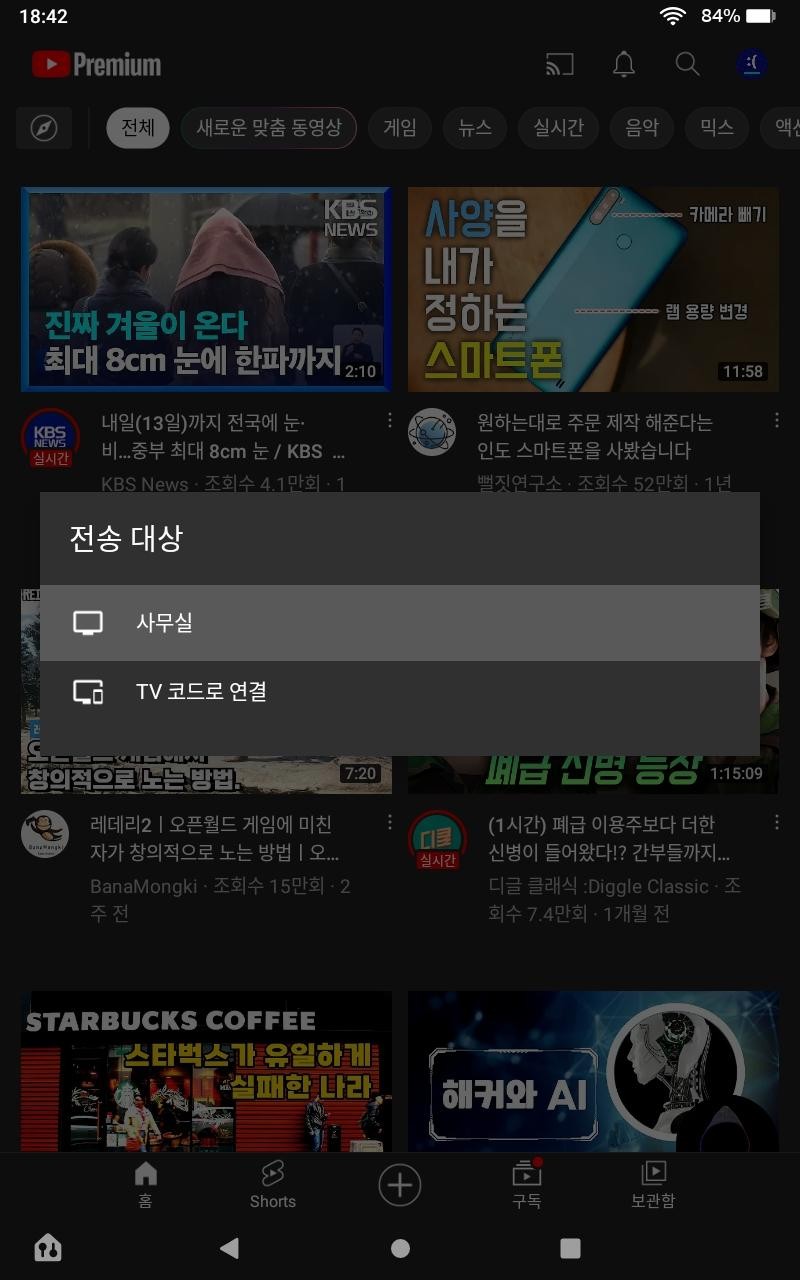 Android 디바이스의 경우에는 여차하면 디바이스의 화면을 직접 미러링할 수도 있다. Google Home 앱의 메인 메뉴에서 미러링할 크롬캐스트 항목을 선택하고 [화면 전송]을 누르면 간단하게 디스플레이 미러링 기능이 작동한다.