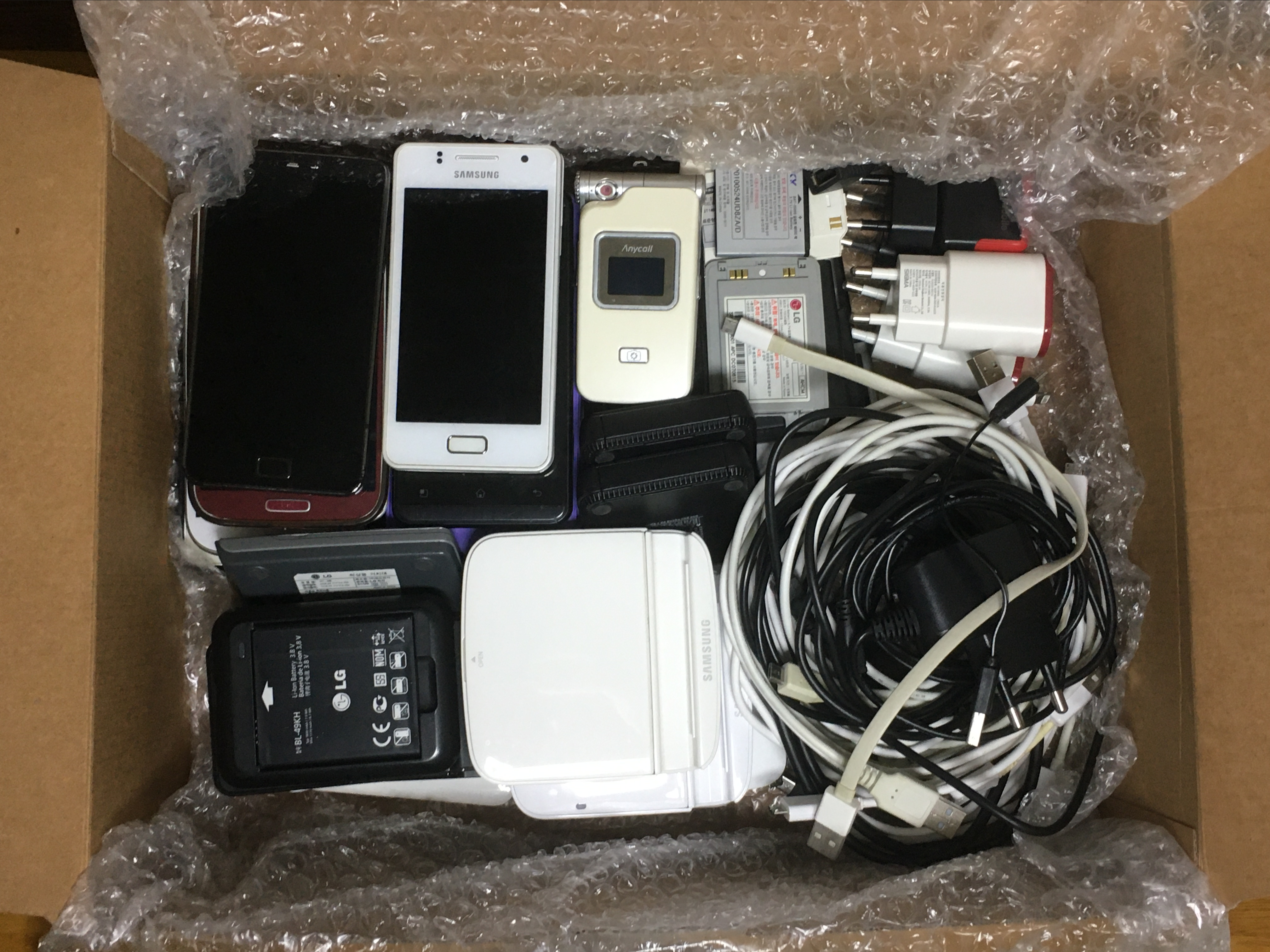 처음에는 폐휴대폰 본체랑 배터리 정도만 보내려고 했지만 창고를 더 뒤져보니 이제는 USB-C타입 케이블과 USB-PD 어댑터에게 자리를 내 주고 쓸모를 잃게 된 5핀 케이블과 저속 충전 어댑터들이 수두룩하게 나와서 이참에 이것들도 같이 보내기로 결정했다.