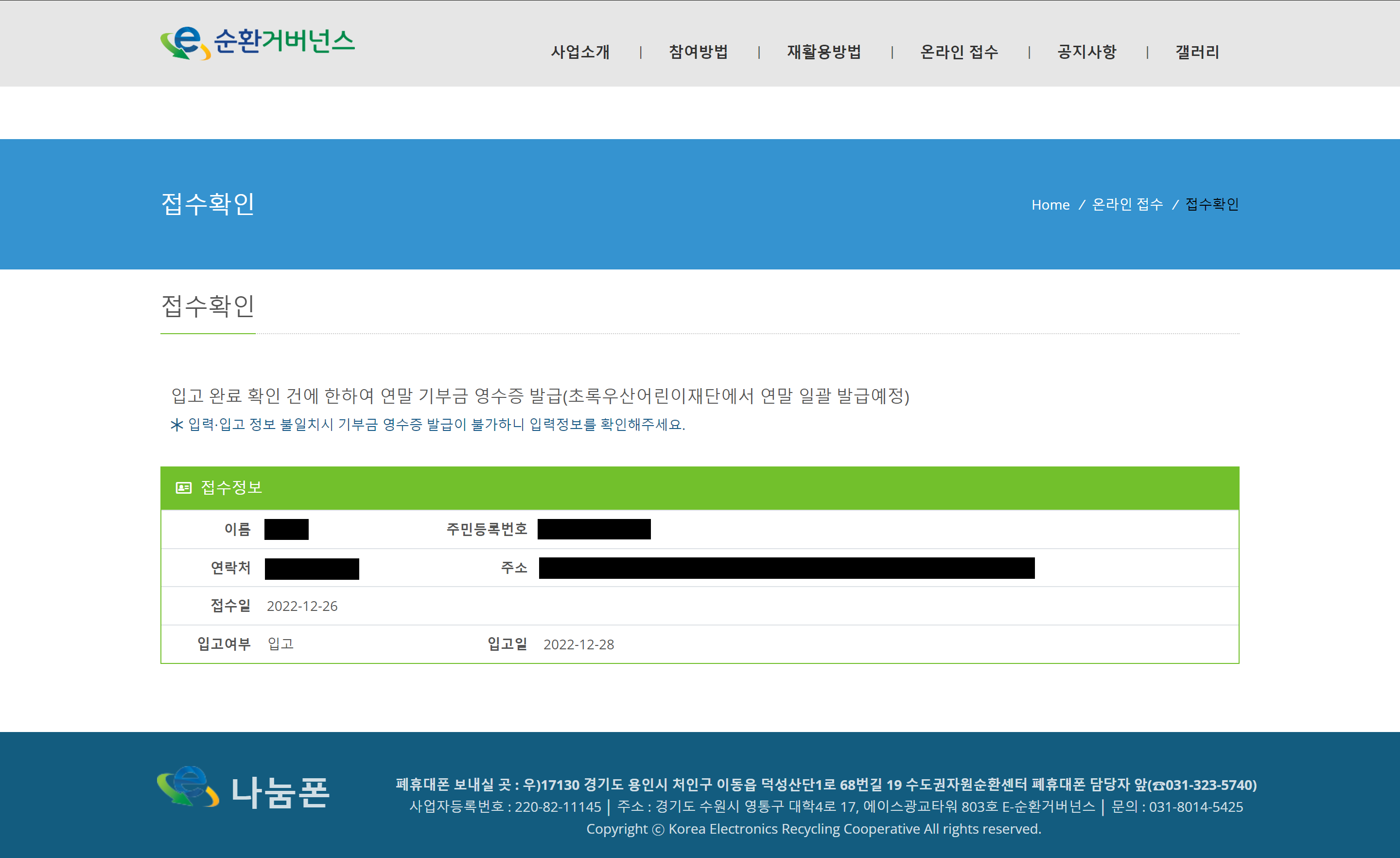온라인 접수를 잘 마쳤다면 6자리 접수 번호가 발급된다. 향후 폐휴대폰 입고 내역을 확인할 때 이 접수 번호가 꼭 필요하므로 잘 메모해 두어야 한다.