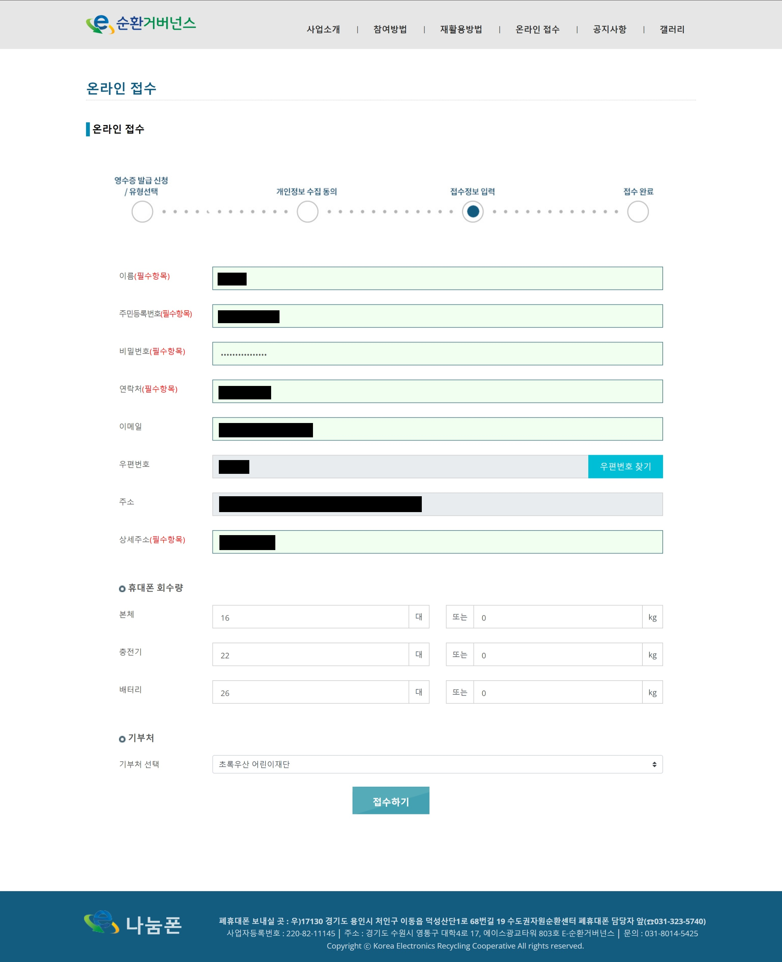 온라인 접수 과정에서 기입하는 정보는 이름, 주민등록번호, 연락처 등의 개인정보와 휴대폰 회수량, 그리고 수익금 기부처다.