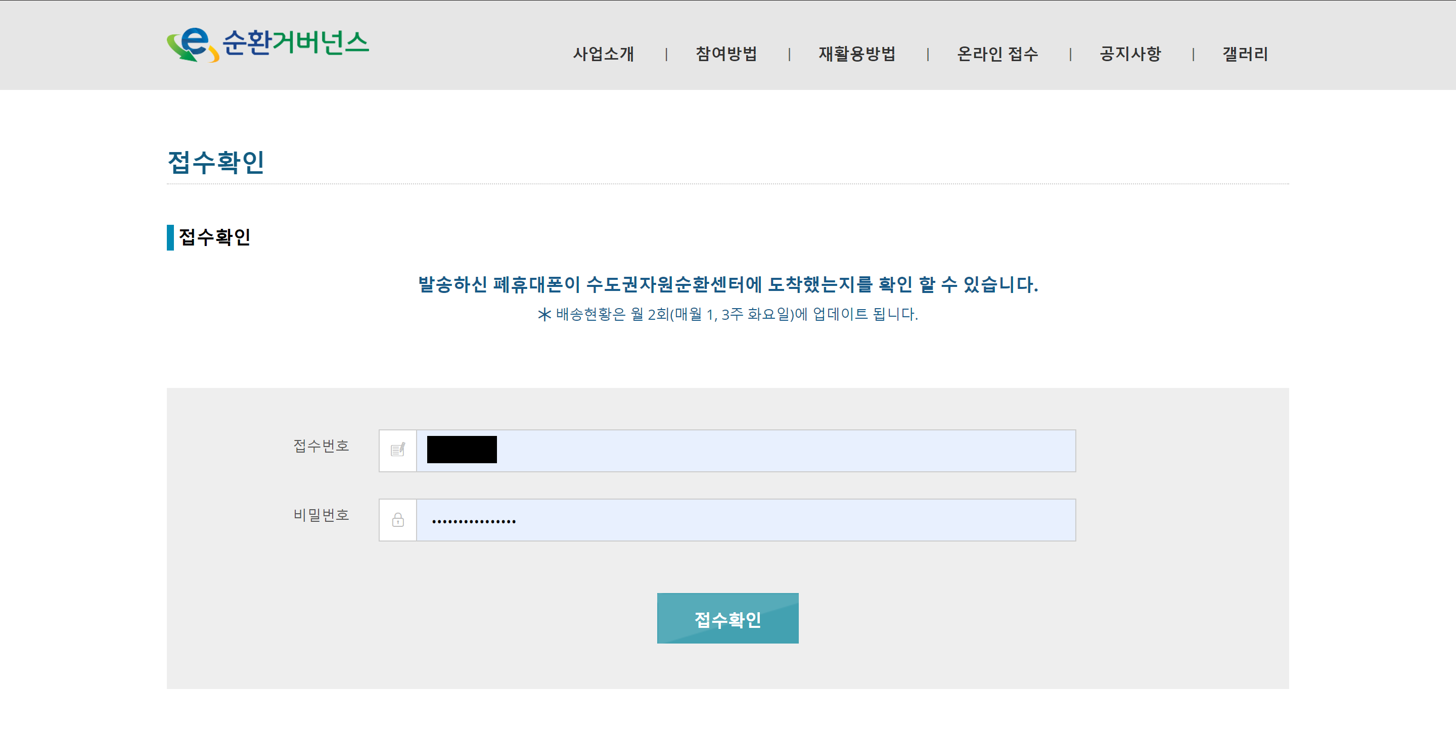 택배가 센터에 잘 도착했는지 확인하고 싶다면 'E-순환거버넌스' 웹사이트(https://나눔폰.kr)의 온라인 접수 확인 메뉴를 통해서 이전에 온라인 접수 과정을 마치고 받은 6자리 접수 번호를 입력하여 확인하면 된다.