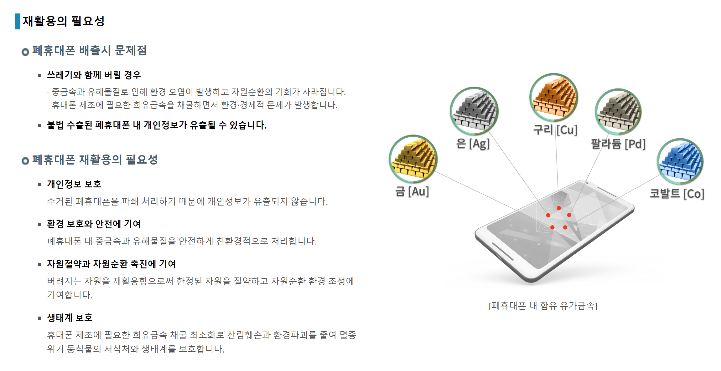 그러나 쓰레기 수거장으로 모인 일반 쓰레기는 보통 매립이나 소각 처분되기 때문에, 이 과정에서 폐휴대폰을 비롯한 전자제품에 포함된 금속 성분이 아무런 재처리 없이 그대로 처분될 경우 환경 오염을 더욱 가속화시킬 수 있다. 그래서 보통 폐전자제품에 대해서는 따로 이들만 수거받는 서비스를 두어 분리 배출을 유도하는 그림이 일반적이다.