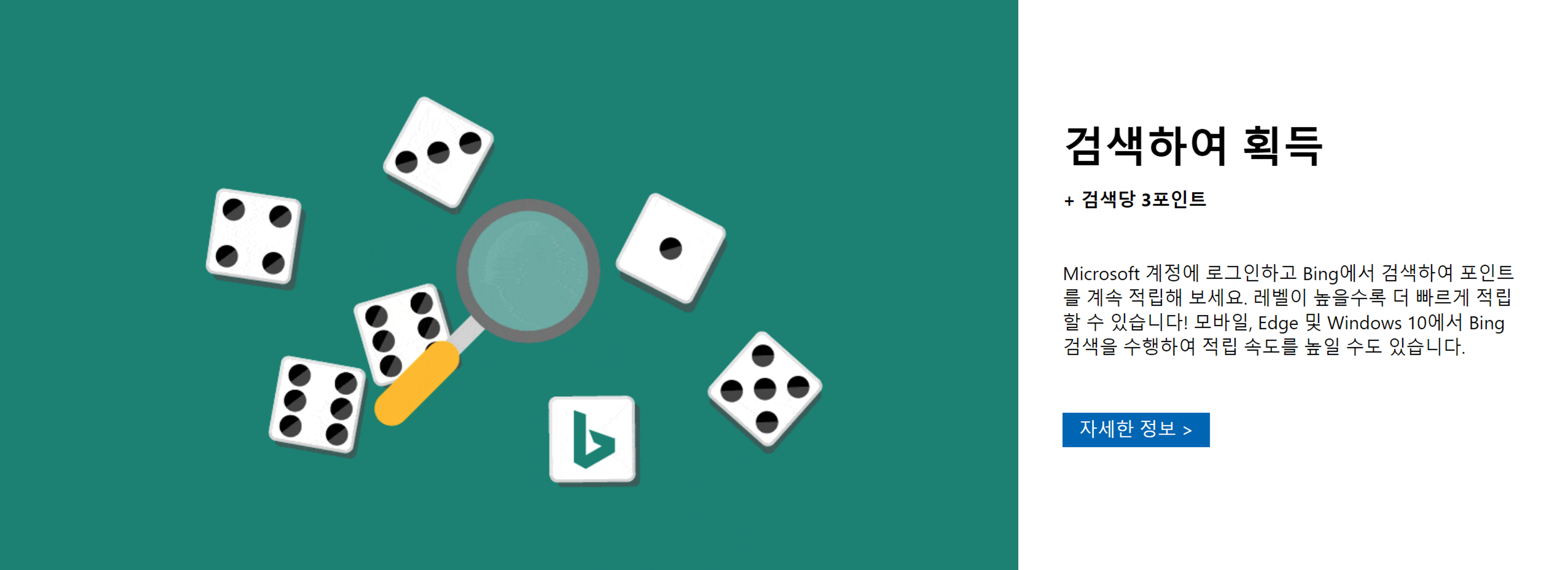 이외에도 마이크로소프트 리워드 웹 사이트(rewards.bing.com)의 'Earn' 메뉴에 표시되는 검색 미션을 수행함으로써 미션 한 개당 5포인트를 적립할 수 있다.