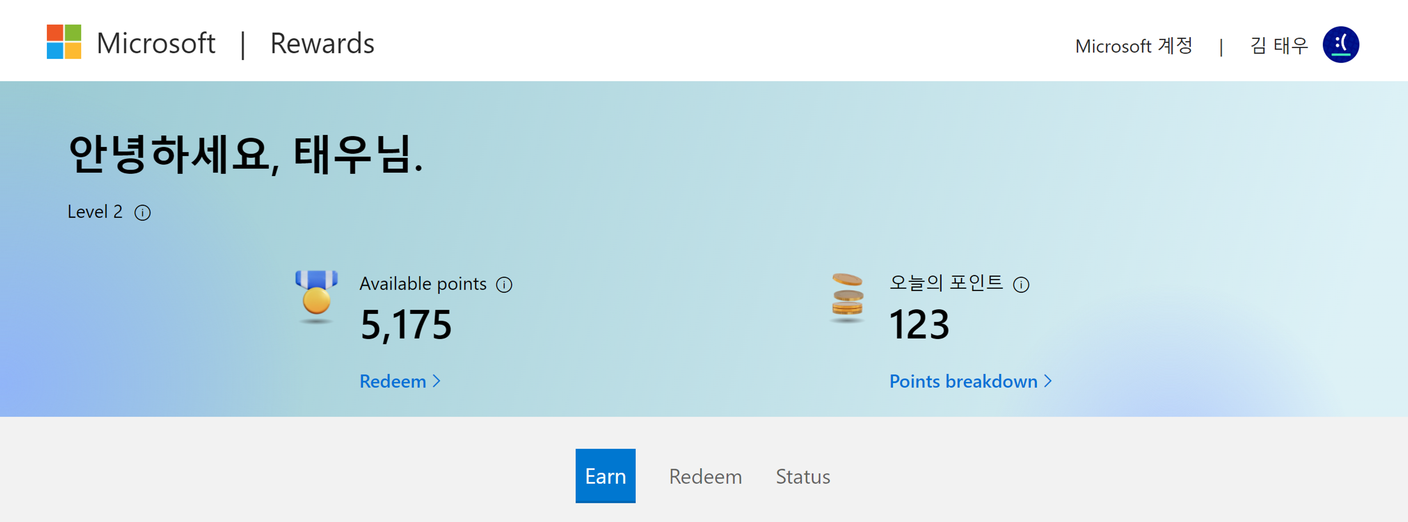 현재까지 모은 포인트의 양은 앞서 언급한 마이크로소프트 리워드 웹 사이트에 가거나, 빙에서도 우측 상단에 상시 노출되는 '마이크로소프트 리워드' 메뉴를 통해 바로 확인이 가능하다.