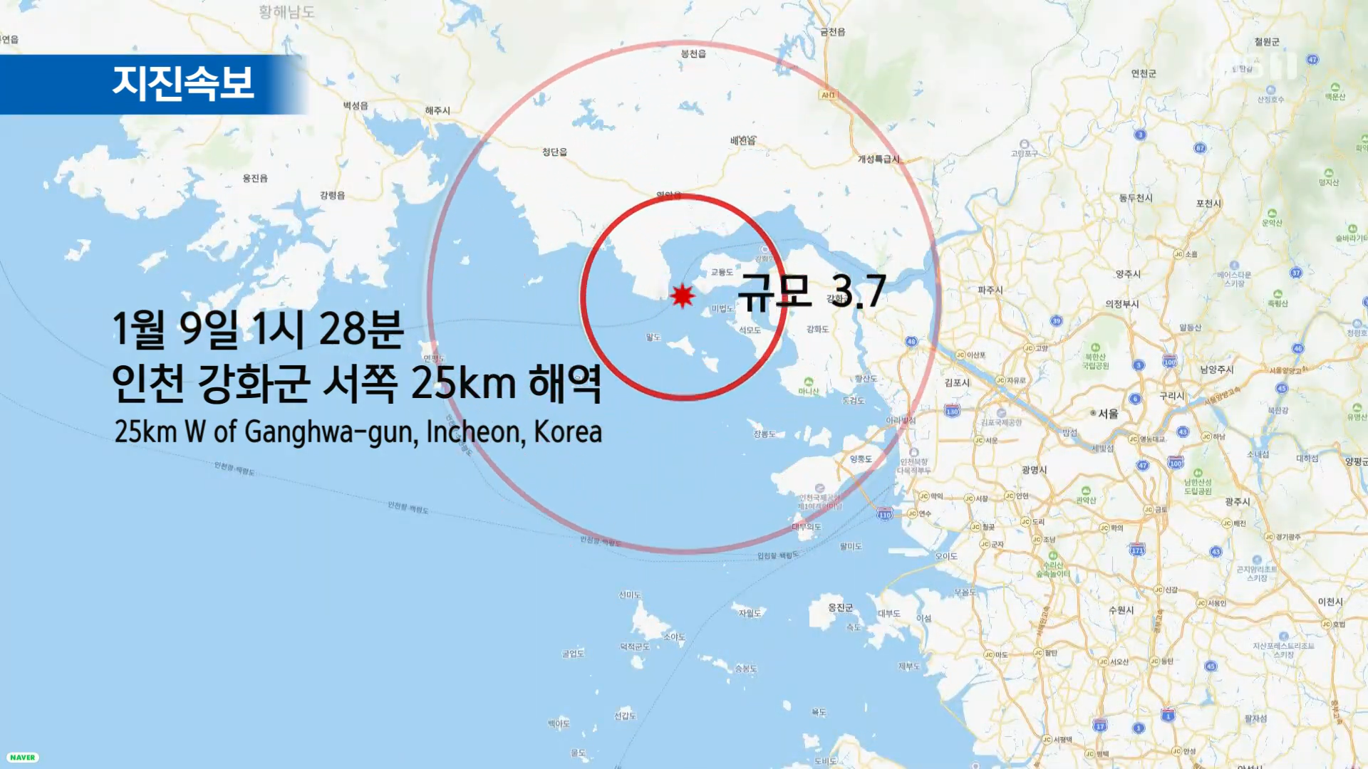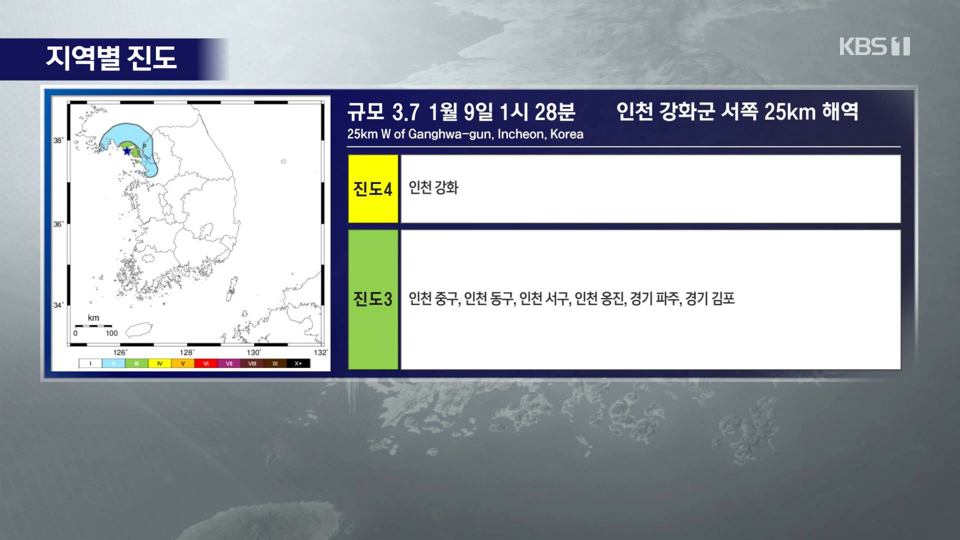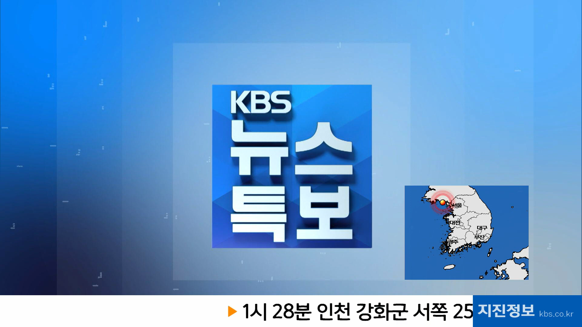 지진이 발생한 지 약 5분이 지난 시점에서는 하단 스크롤형 자막과 진원지 약도로 구성된 '지진정보'가 송출된다.