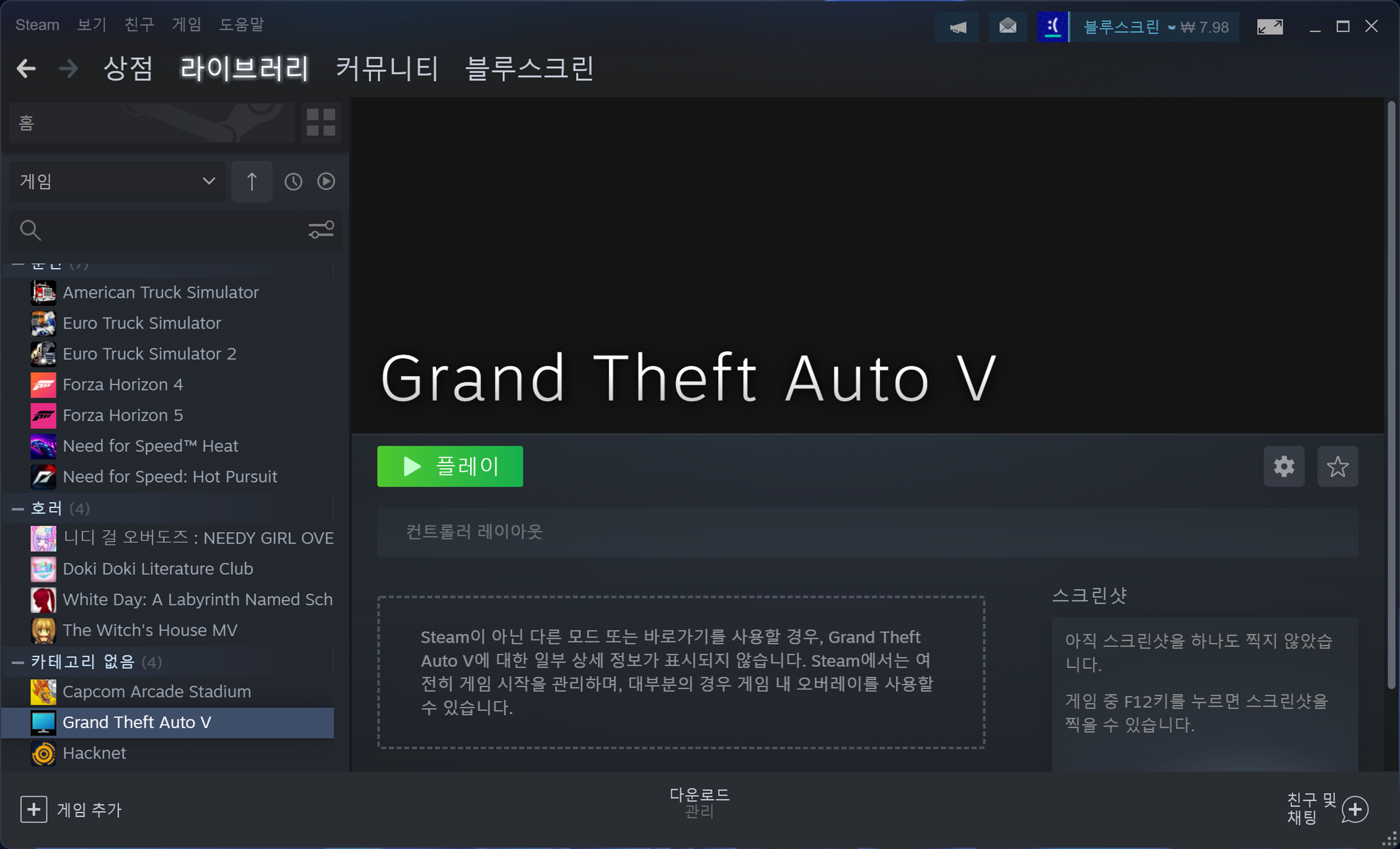 8. GlosSI 프로그램에서 추가한 게임이 스팀 라이브러리에도 잘 추가되었다. '플레이' 버튼을 누르면 게임이 시작되는데, 여기서 USB 장치 연결음이 들리면 성공한 것이다.