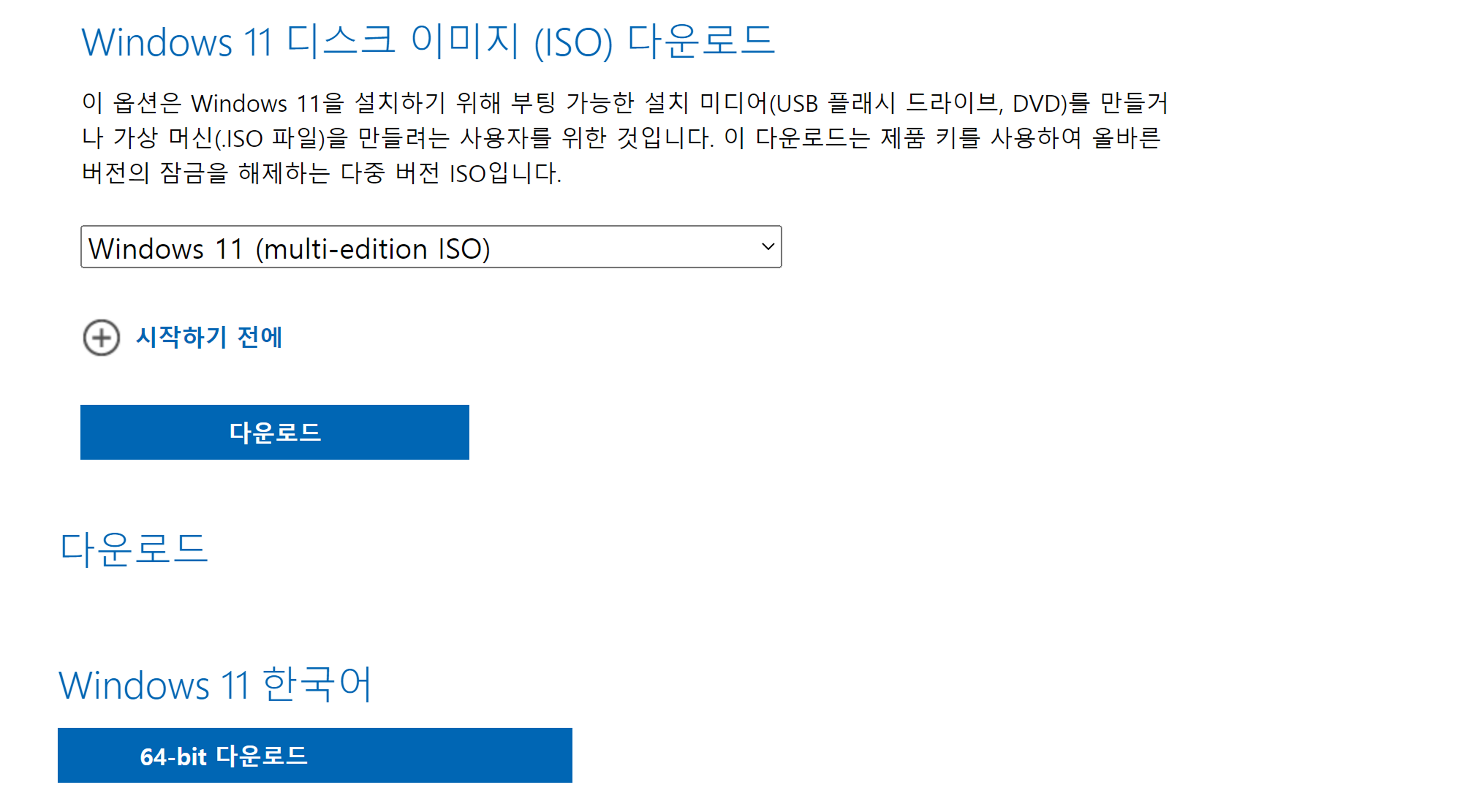 2. 마이크로소프트 공식 사이트에서 윈도우 설치를 위한 ISO 이미지를 다운로드 받는다. 이 글에서는 윈도우 11로 진행하지만 윈도우 10을 설치하는 경우라도 방법은 거의 동일하다.