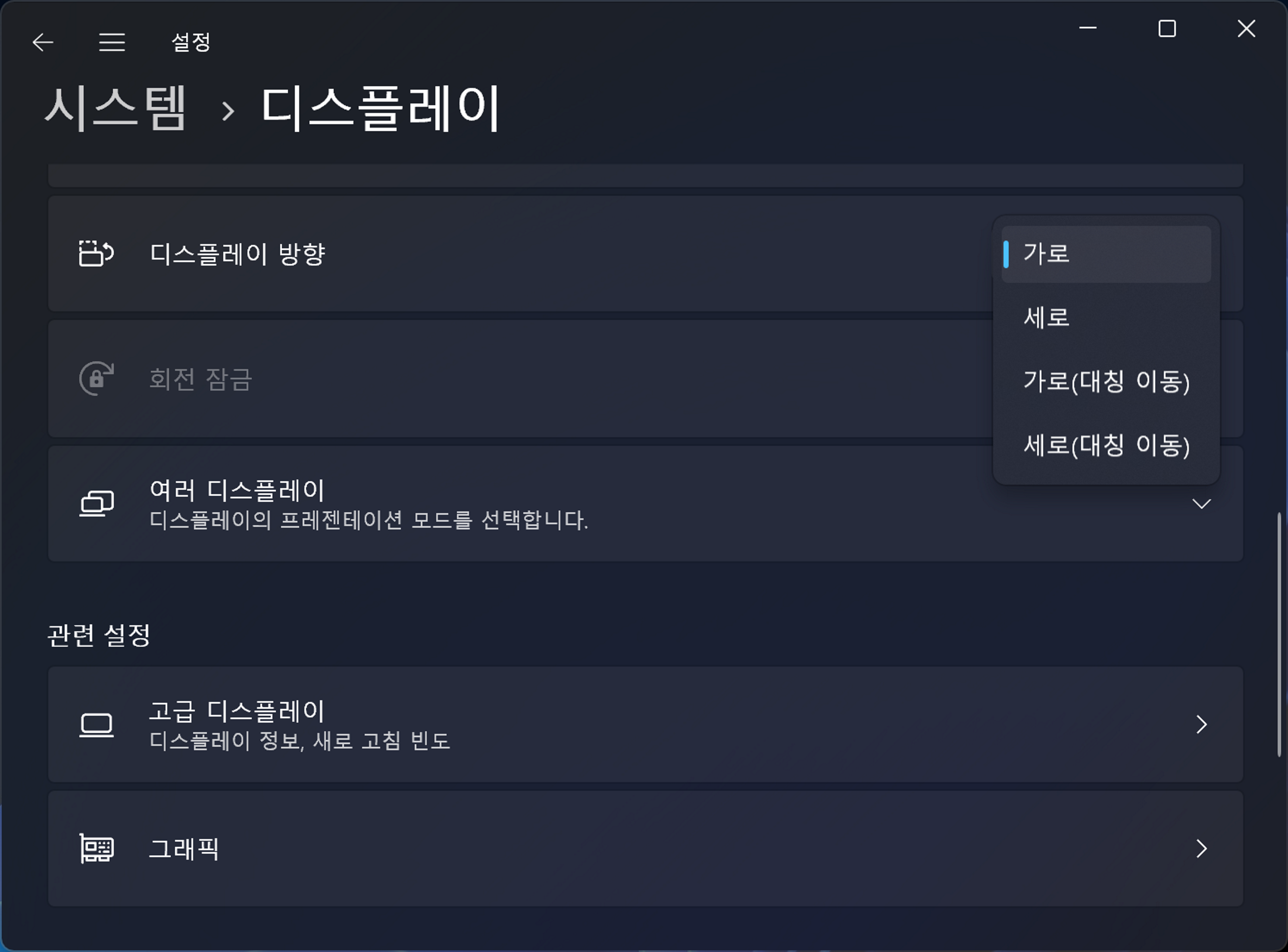 [설정] > 시스템 > 디스플레이에서 디스플레이 방향을 '가로'로 설정한다.