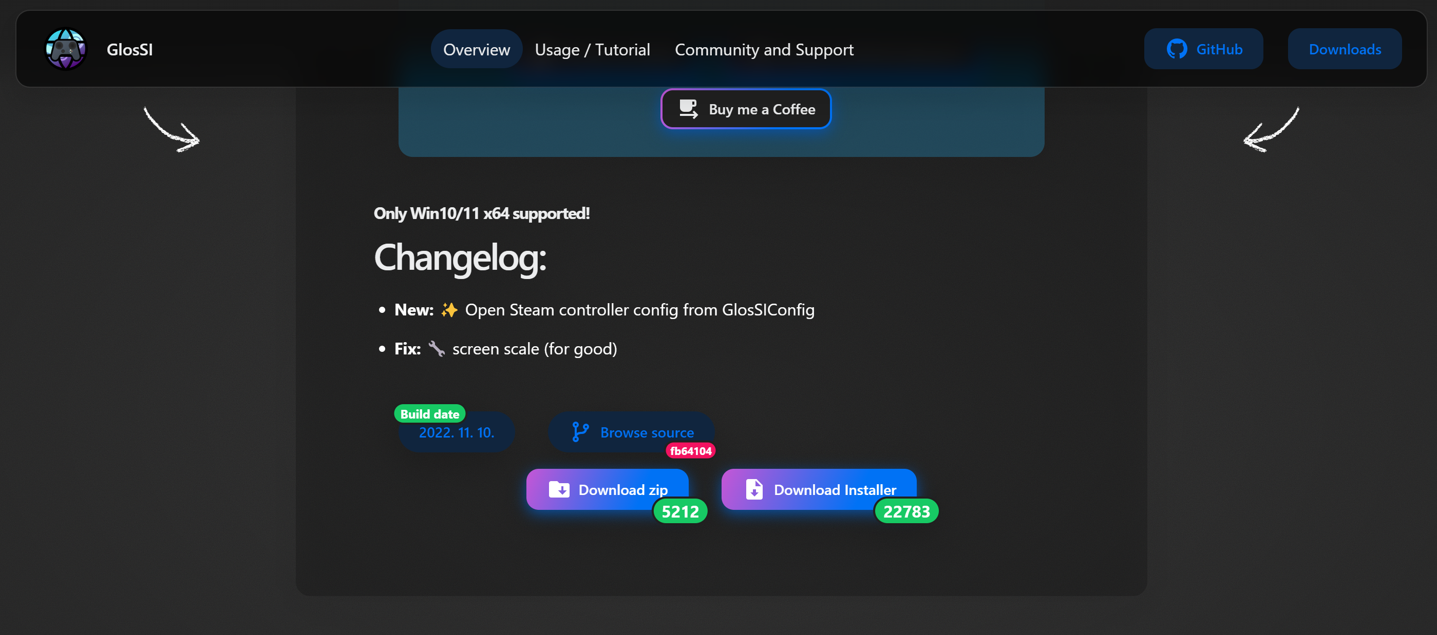 1. GlosSI 다운로드 웹 사이트에 들어가서 [Download Installer]를 클릭해 설치 파일을 다운로드한다.