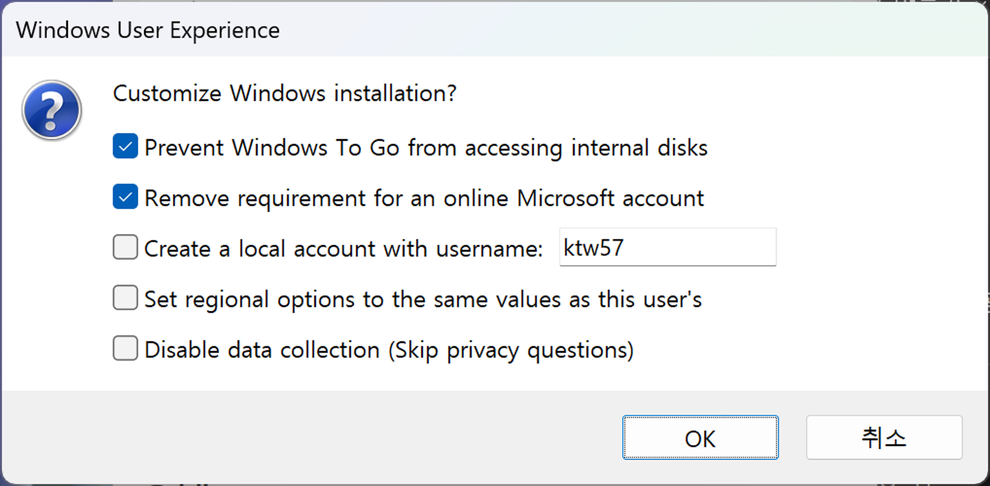6. 윈도우 환경 구성 시 사용자 계정 생성 등의 사전 작업을 미리 처리해 놓을 지 묻는 부분이다. 그냥 기본값으로 체크된 대로 진행해도 문제 없다. [OK].
