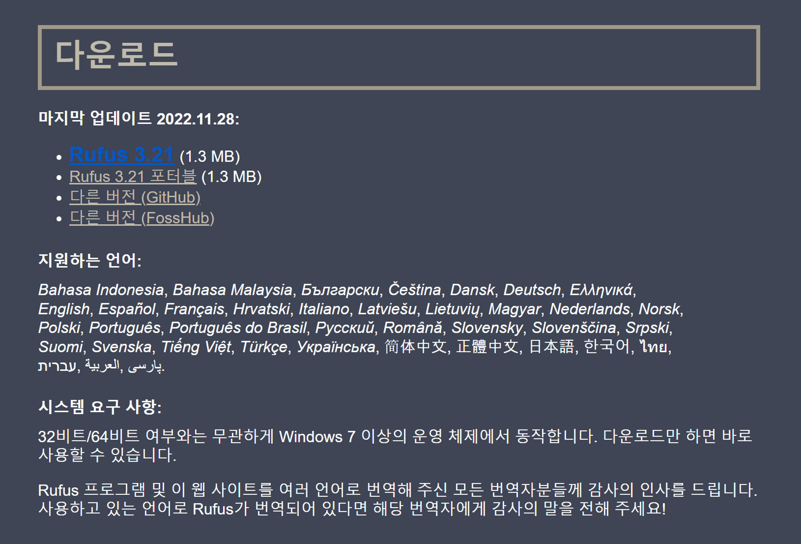 3. Windows To Go 드라이브를 구성할 용도로 쓸 Rufus 프로그램을 다운로드 받는다.