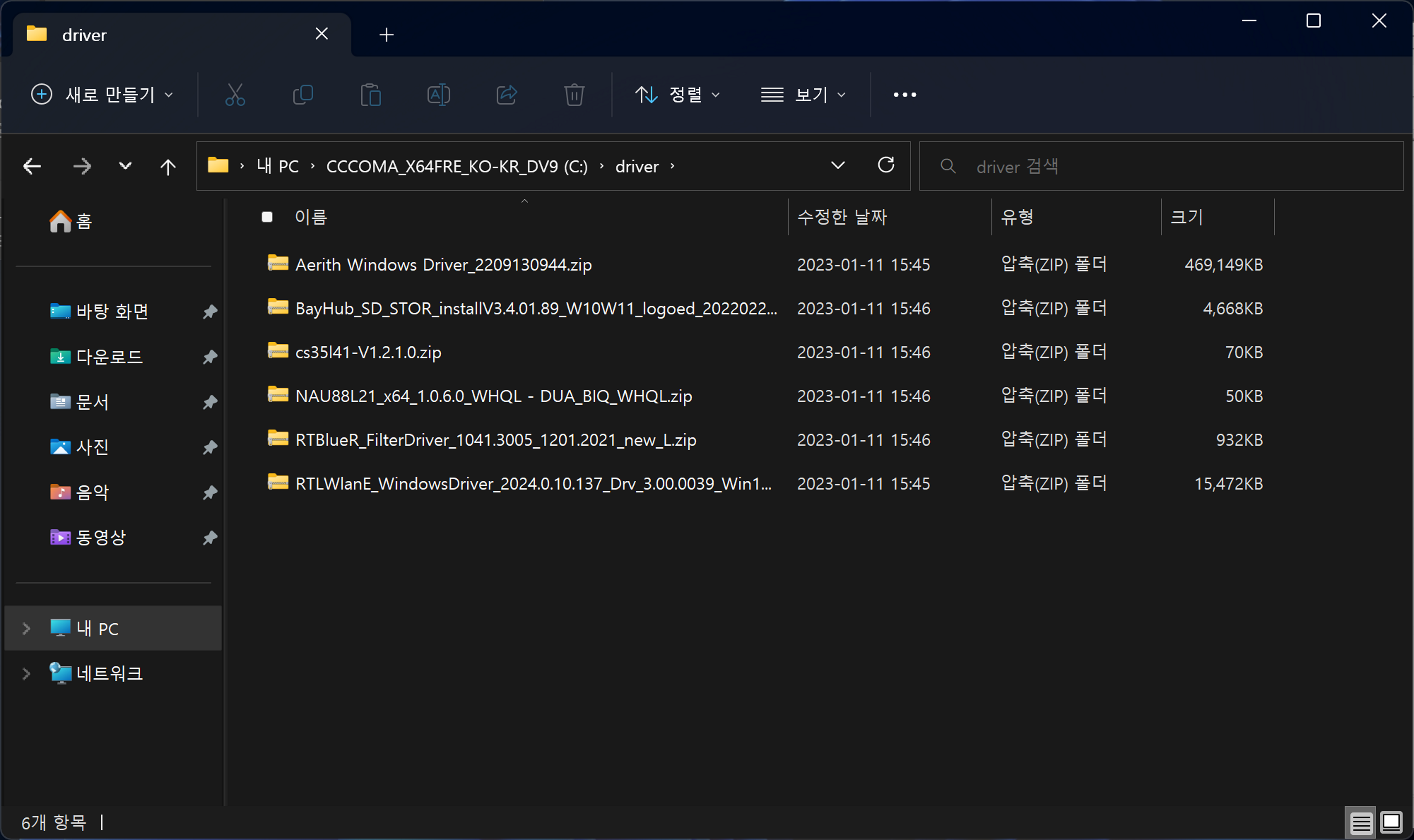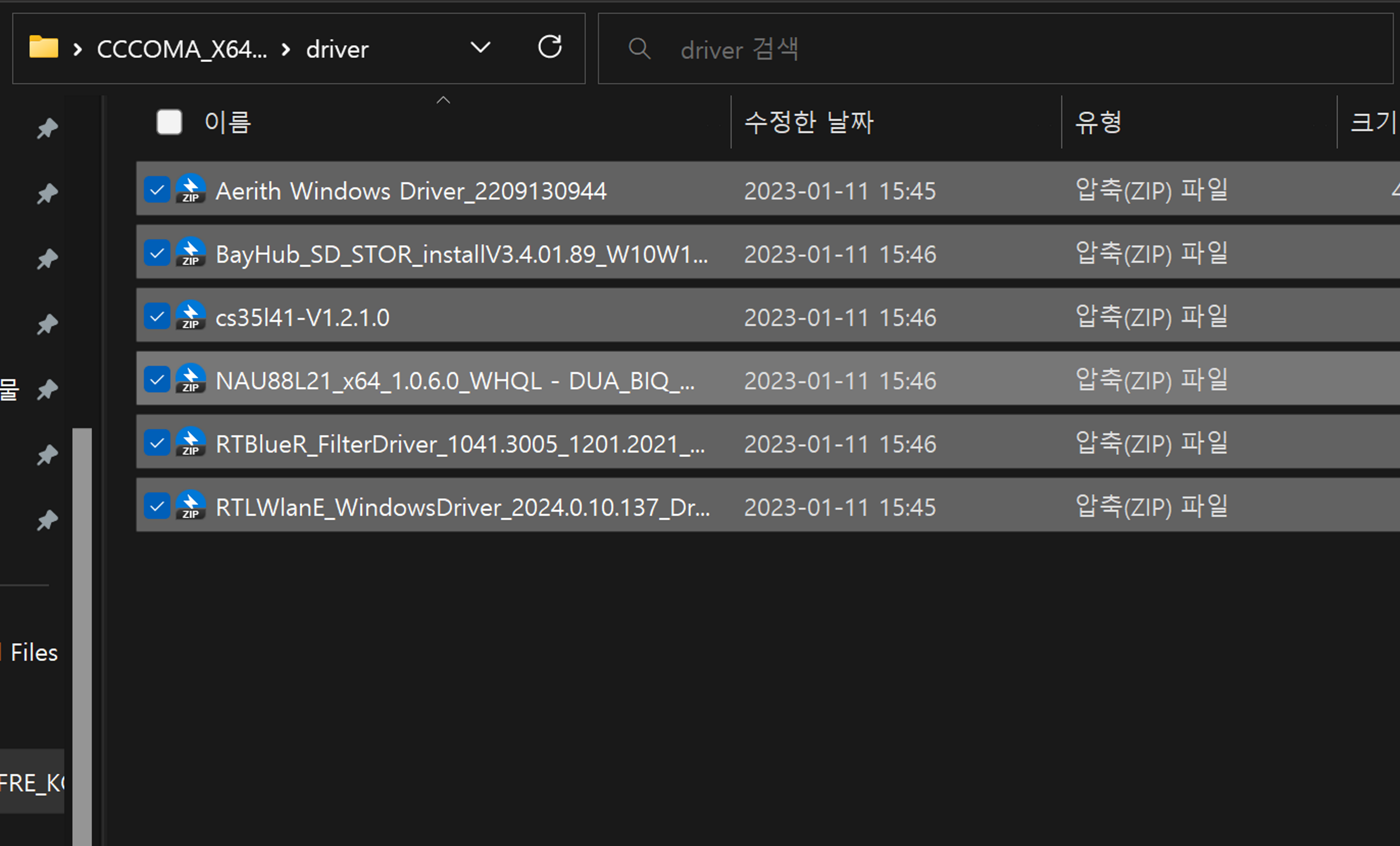 윈도우 설치 과정 중 9번 단계에서 복사해 놓았던 드라이버 설치 파일들이 있는 폴더가 C드라이브 최상단에 있을 것이다. 하나하나 압축을 풀어 드라이버를 설치한다.