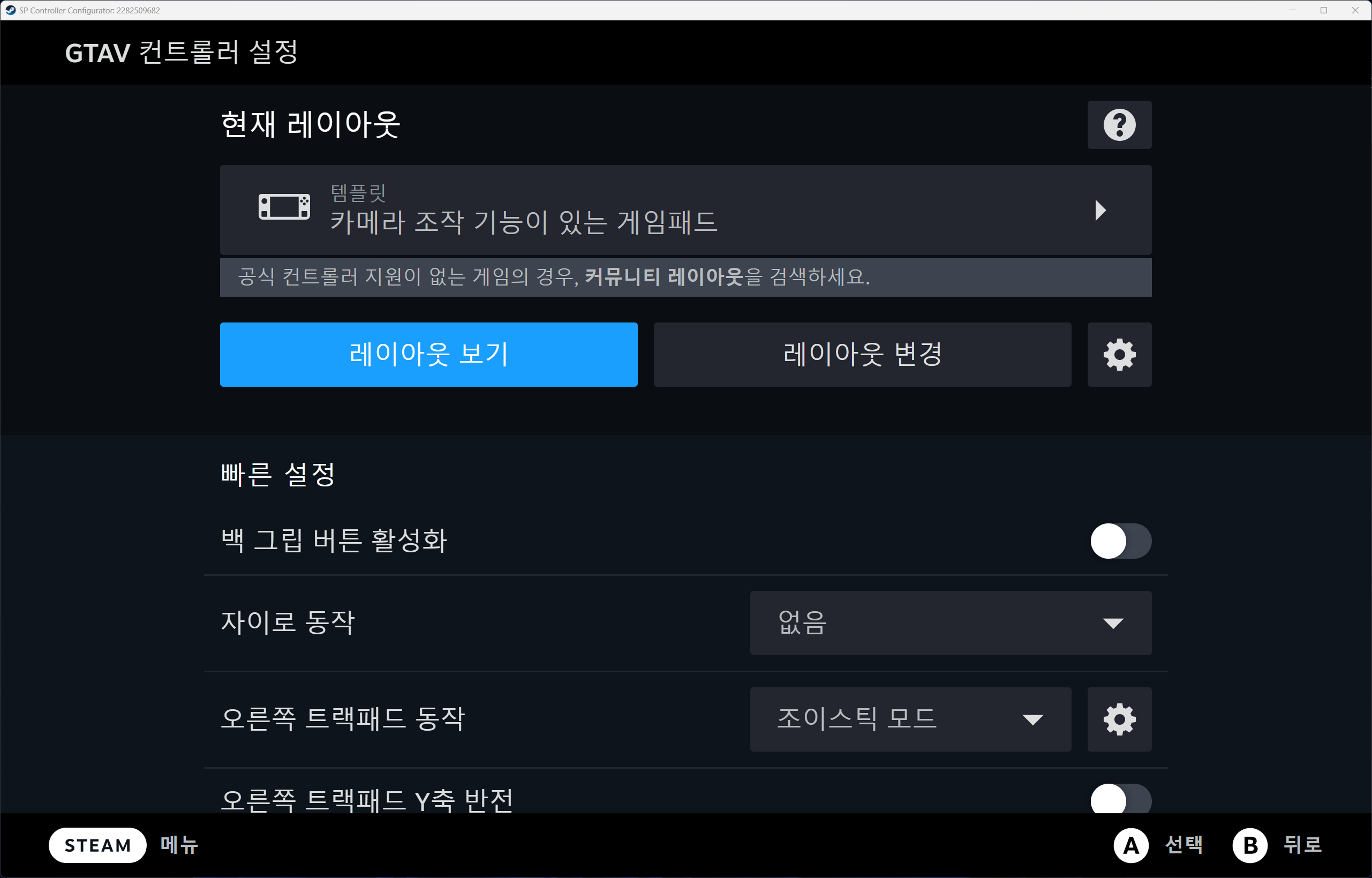 바로 게임에서 현재 입력 유형을 게임 컨트롤러가 아니라 키보드로 인식하기 때문에 스팀 덱의 컨트롤러로 정상적인 조작이 불가능하다는 것이다. 심지어 GTA5에서는 아날로그 스틱을 돌려도 카메라 각도만 바뀔 뿐 이동조차도 할 수 없다.