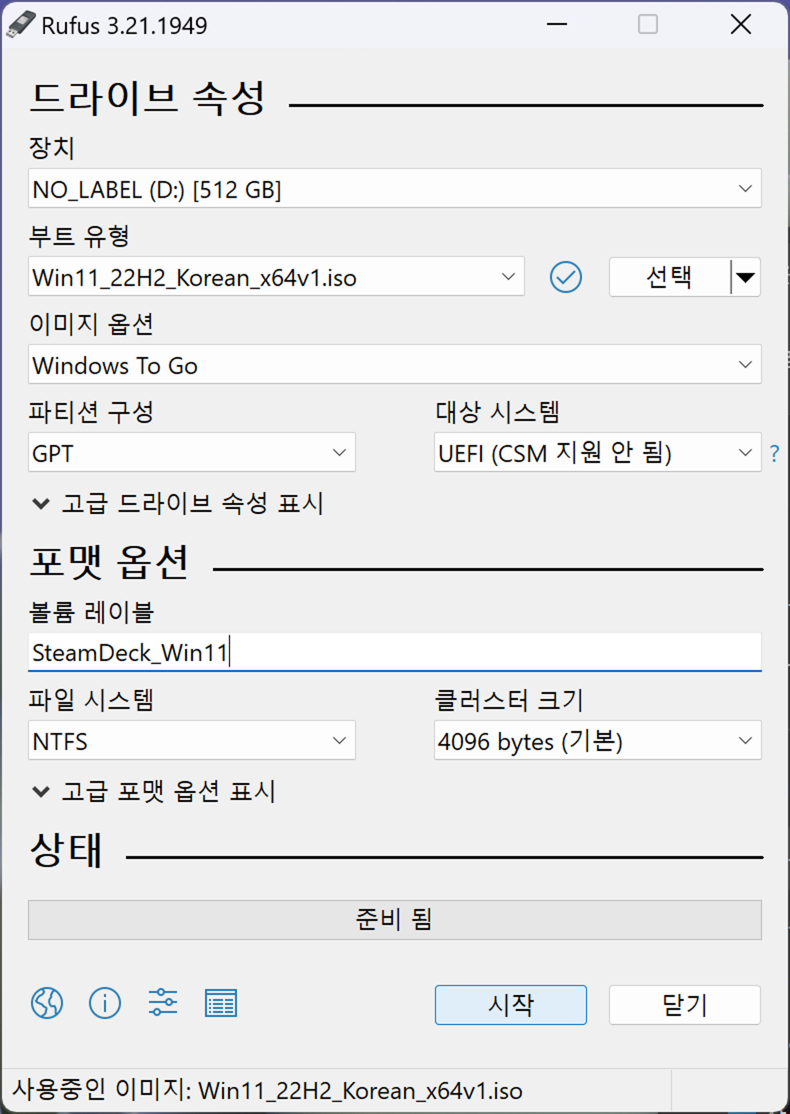 4. MicroSD 카드가 PC에 연결된 상태에서 Rufus 프로그램을 실행한 후 다음과 같은 옵션으로 설정하고 [시작].
