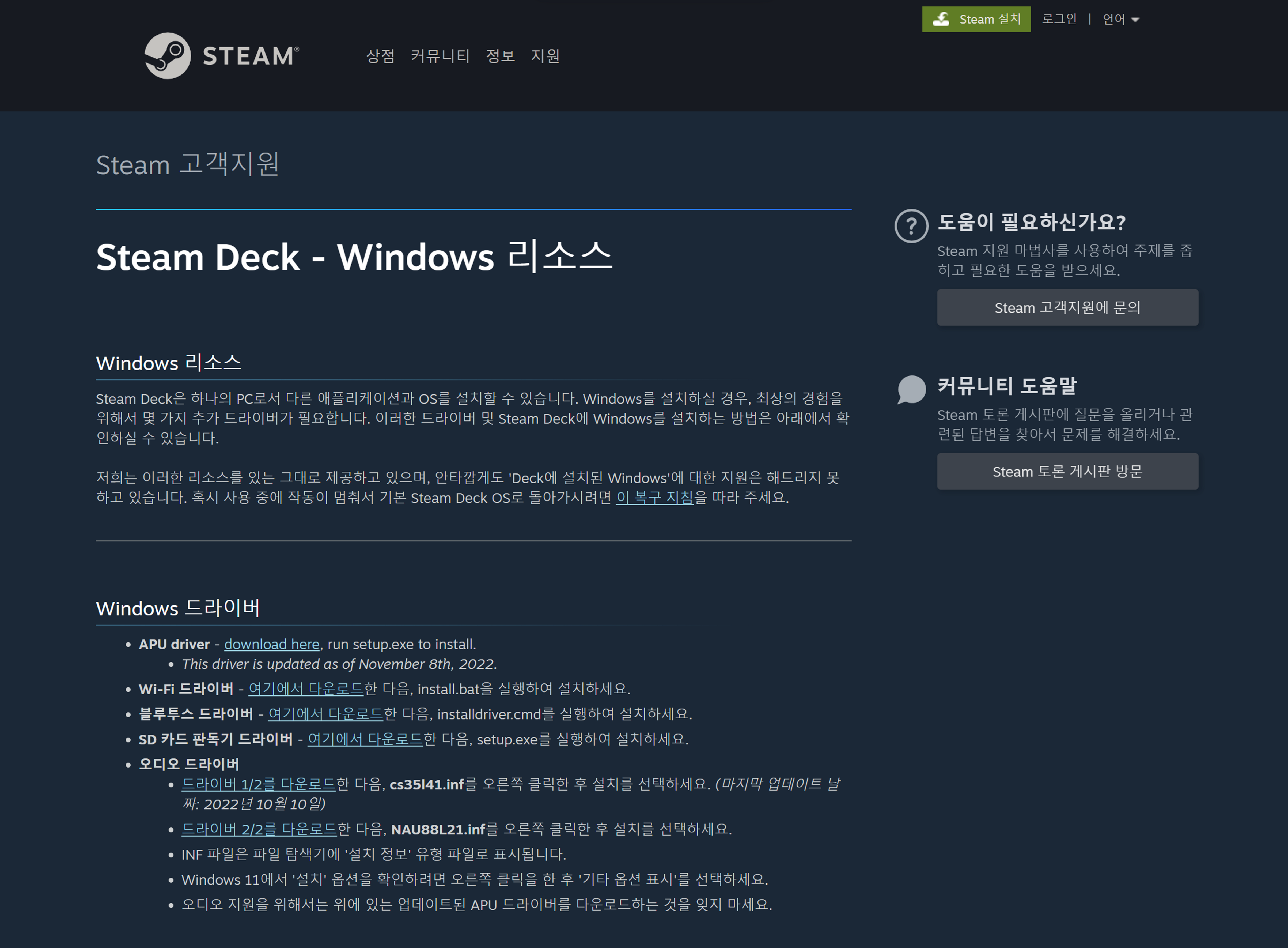8. 스팀 고객지원 사이트에 들어가 스팀 덱용 윈도우 드라이버 설치 파일을 다운로드 받는다.
