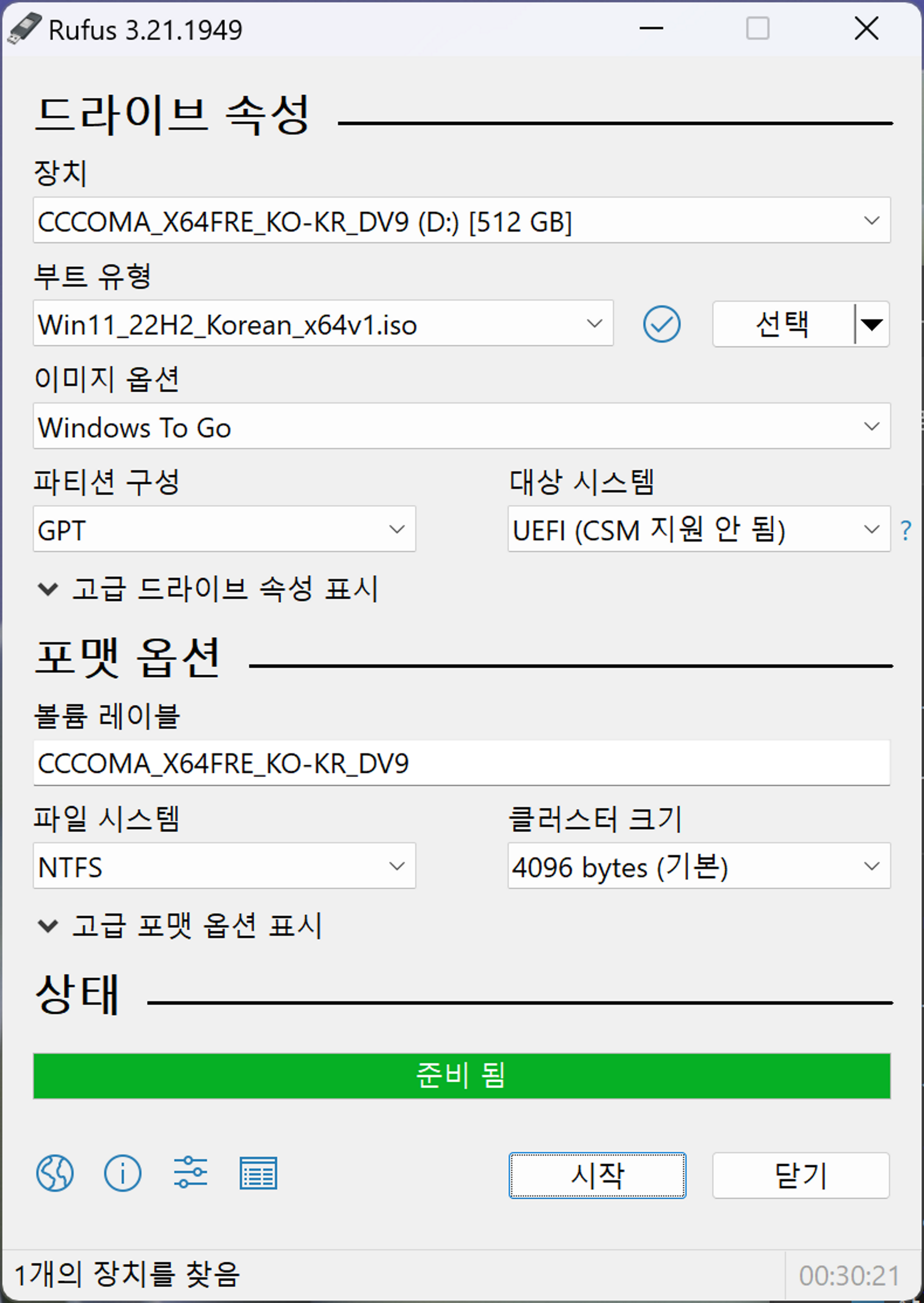 7. USB 3.0 기준으로 작업에 약 30분 가량 소요된다. 작업이 모두 완료되고 진행 바에 '준비 됨'이라는 표시가 뜨면 [닫기].