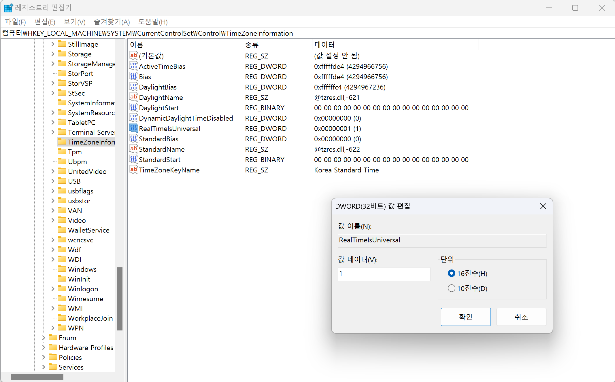 2. RealTimeIsUniversal 이라는 이름의 DWORD(32비트) 값 생성 ➡️ 값 데이터는 16진수 '1'