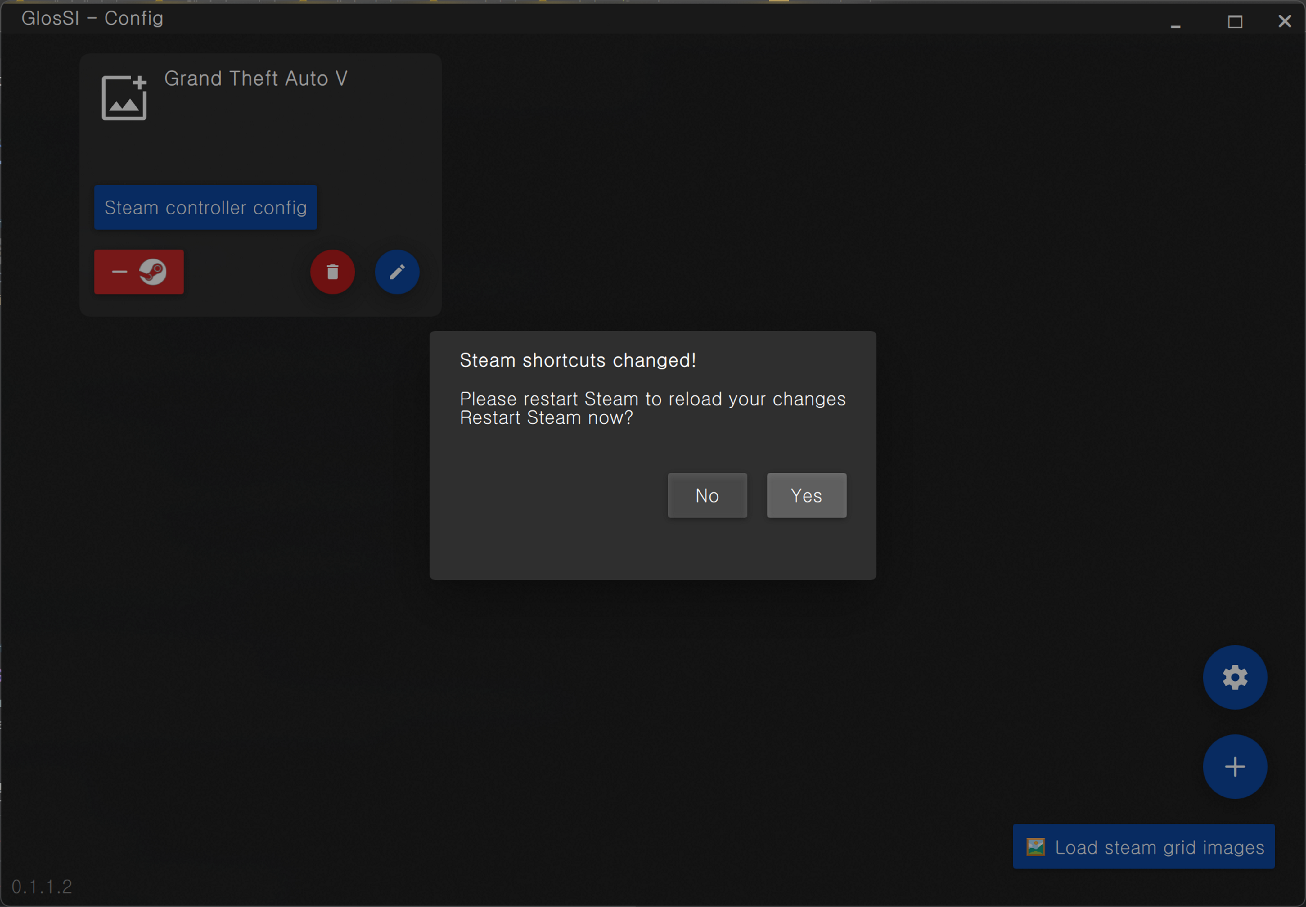 7. GlosSI 프로그램 창을 닫으려고 하면 스팀 클라이언트를 재시작하겠냐는 메시지가 뜬다. 방금 추가한 게임이 스팀 라이브러리에 정상적으로 반영될 수 있도록 하는 과정이므로 되도록이면 'Yes'를 눌러 스팀 클라이언트를 한 번 재시작해 준다.