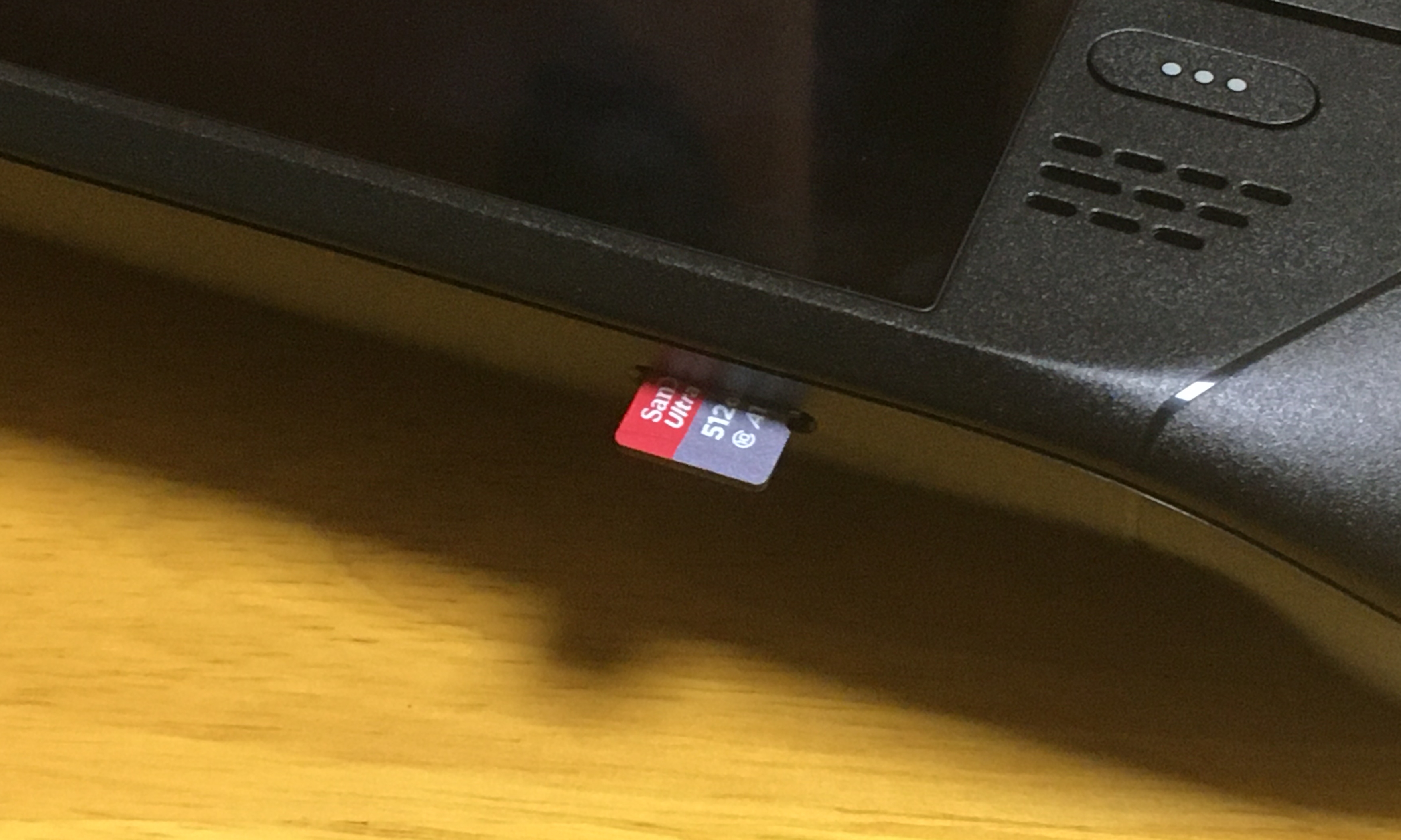10. 스팀 덱의 전원을 완전히 끄고, MicroSD 카드를 투입구에 끼워 넣는다.