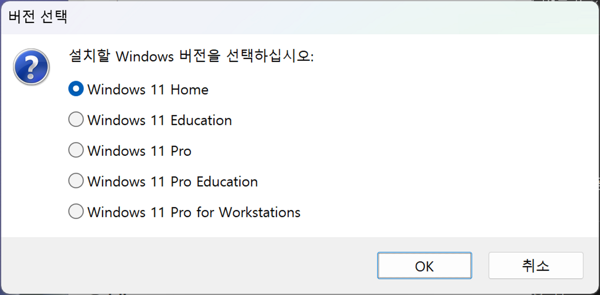 5. 설치할 윈도우 에디션 유형을 선택하고 [OK].
