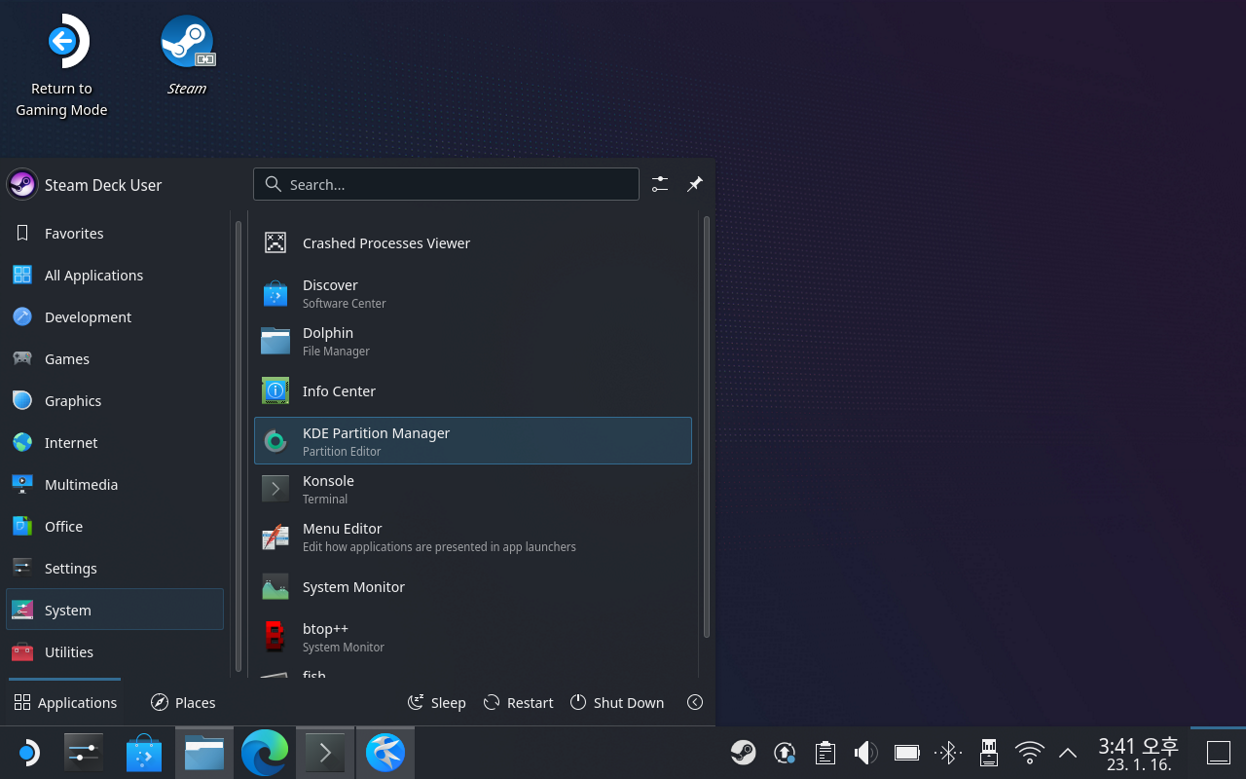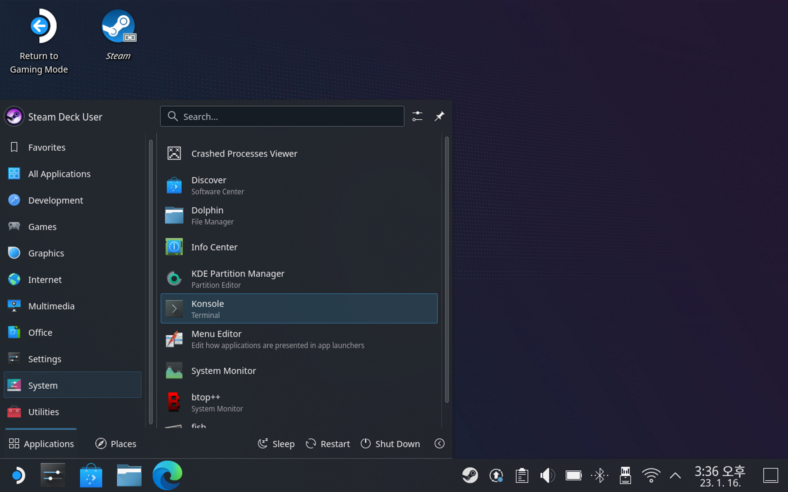 1. 스팀 OS에서 데스크톱 모드로 진입한 뒤, Konsole(터미널) 실행